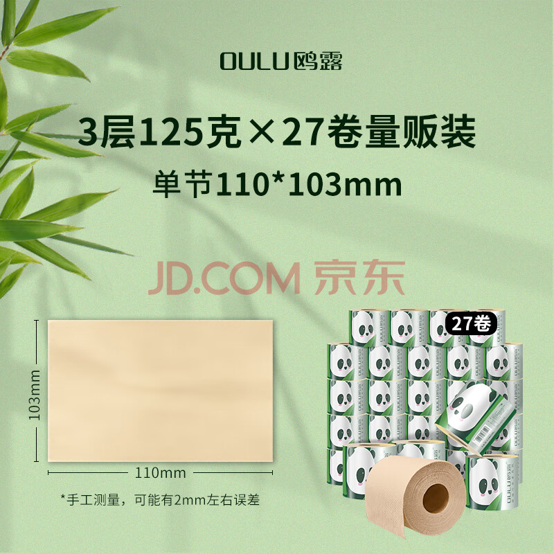 商品相册:鸥露(OULU)有芯卷纸 3层120克*27卷 卫生纸厕纸本色纸 原生竹浆 卷筒纸 整箱第