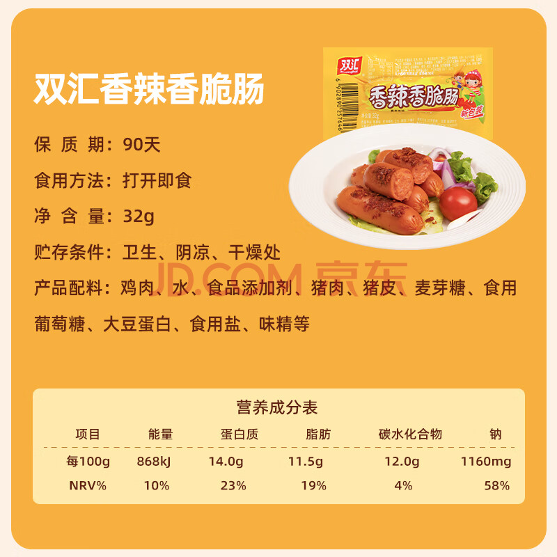 商品相册:双汇香辣香脆肠 32g*60支整箱装 休闲零食 香肠 脆皮肠 速食 出游第