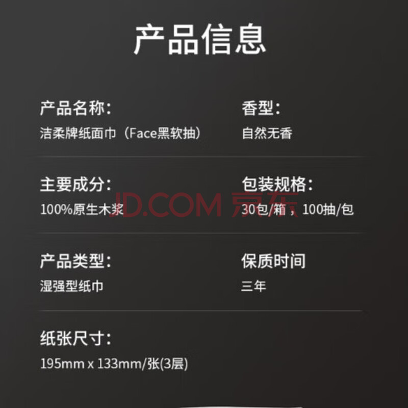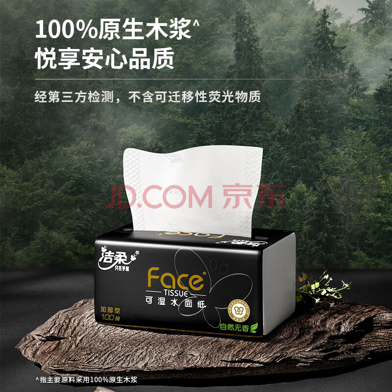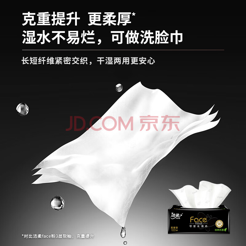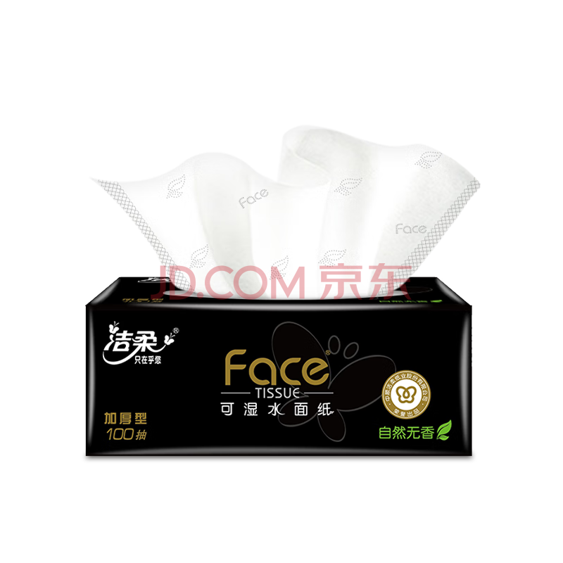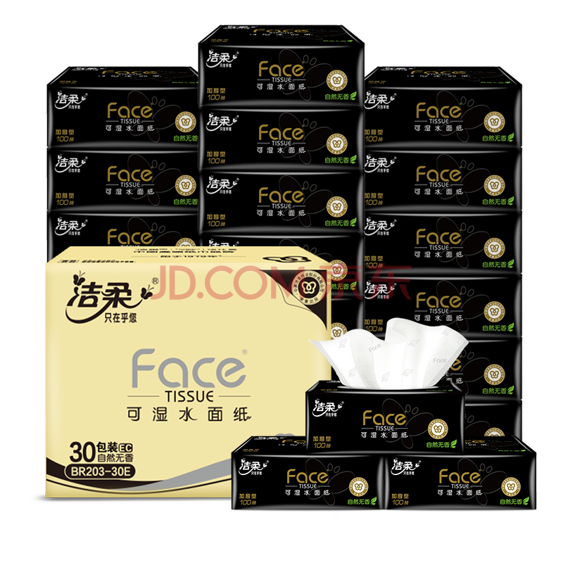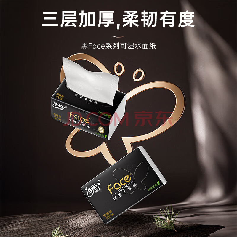 商品相册:洁柔抽纸 黑Face3层100抽*30包 可湿水面巾纸 厚实 干湿两用纸巾 整箱第