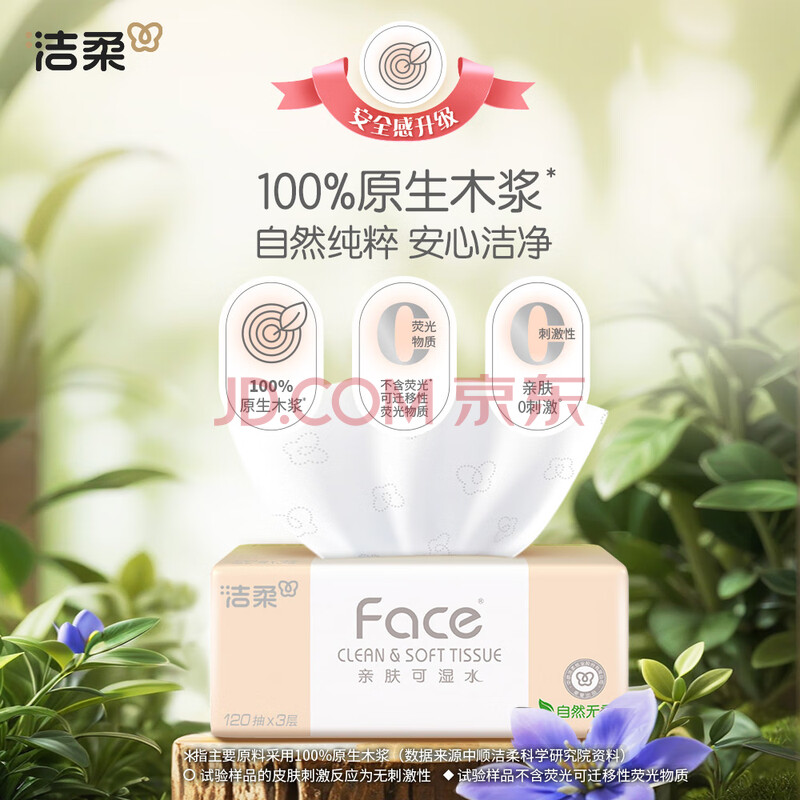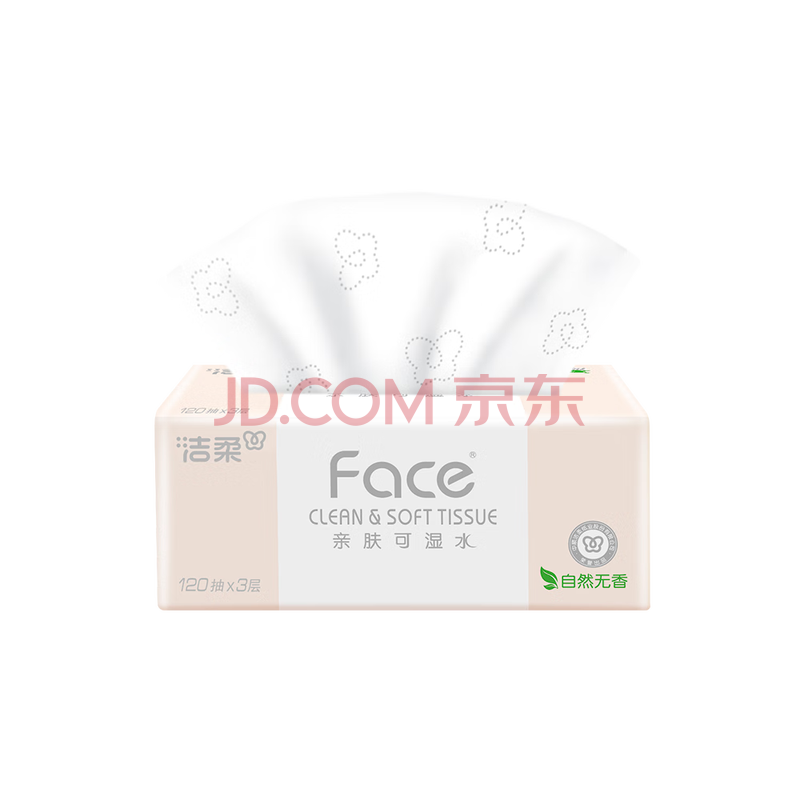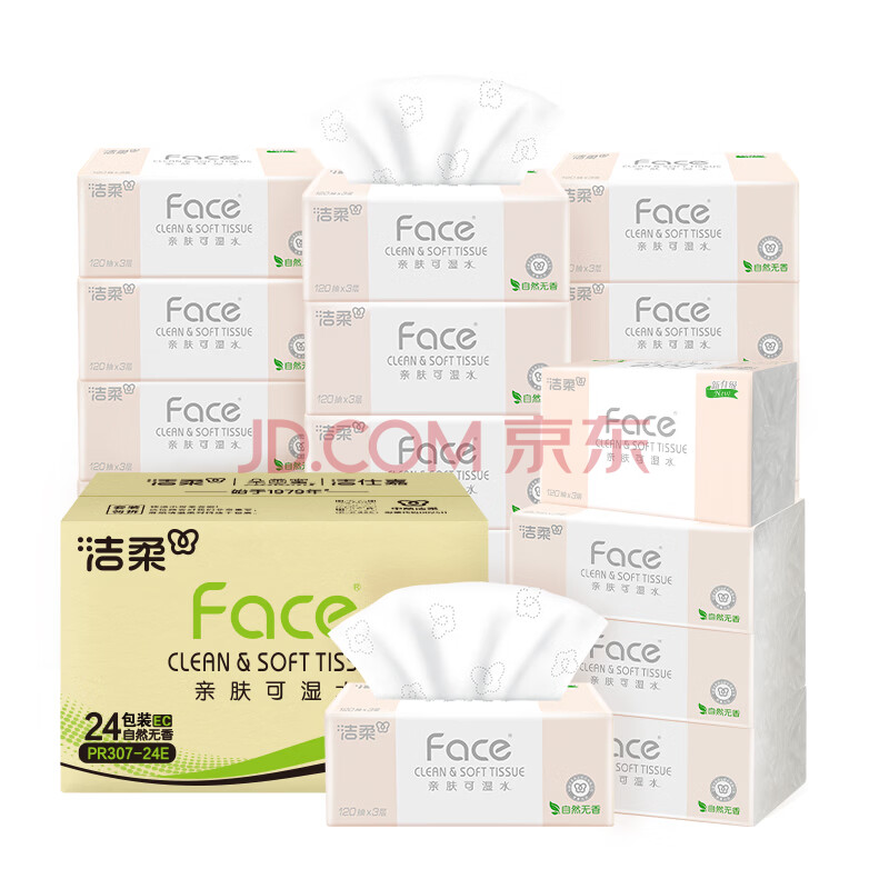 商品相册:洁柔抽纸 粉Face柔韧3层120抽*24包 可湿水 原生木浆面巾纸 整箱纸巾第