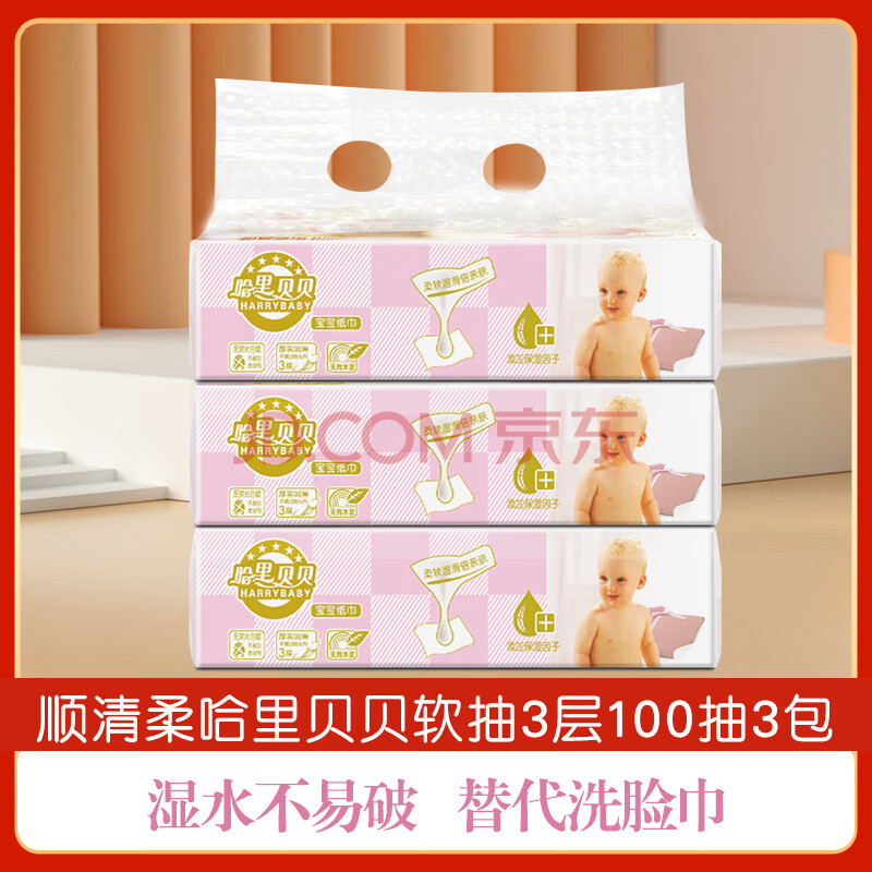 商品相册:顺清柔 乳霜抽纸哈里贝贝3层100抽*3包M码 抽取式面巾纸软抽 提装销售第