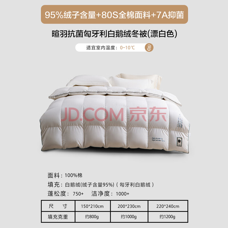商品相册:水星家纺羽绒被95%白鹅绒被子冬季加厚冬被芯单人羽绒被150cm×210cm-800g第