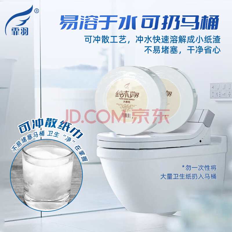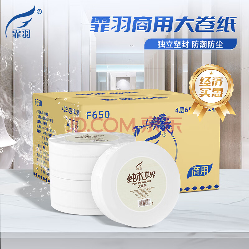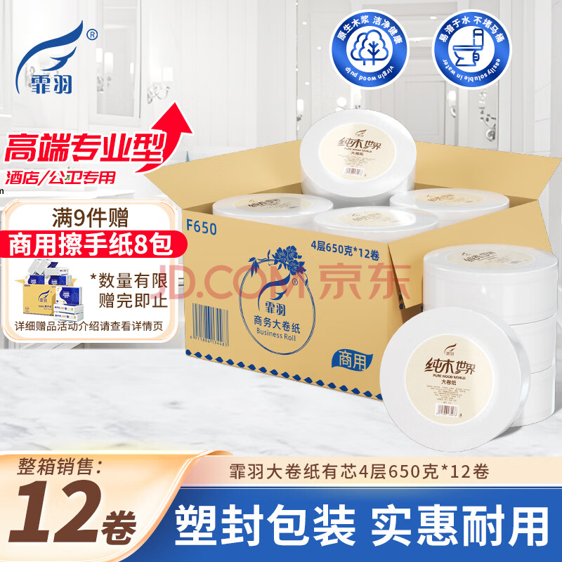 商品相册:霏羽大卷纸有芯4层650克*12卷商用大盘纸可溶水加厚酒店厕纸整箱F650第