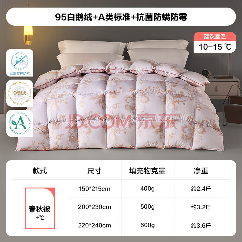 商品相册:LOVO罗莱 A类 95%白鹅绒羽绒被 抗菌春秋被600g填充220*240cm花色第
