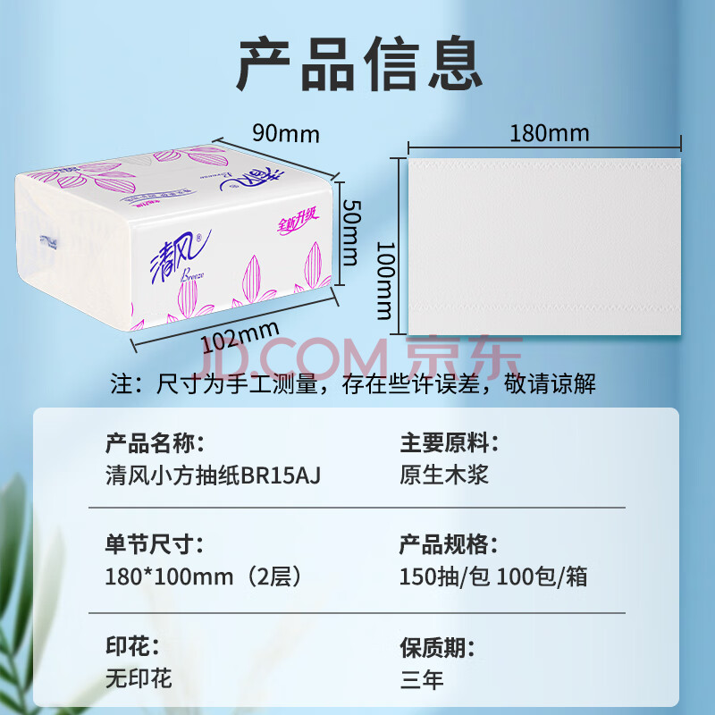 商品相册:清风超韧2层抽纸150抽*100包整箱装 家用实惠装 原生木浆面巾纸BR15AJ第