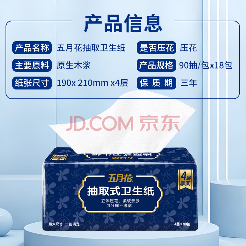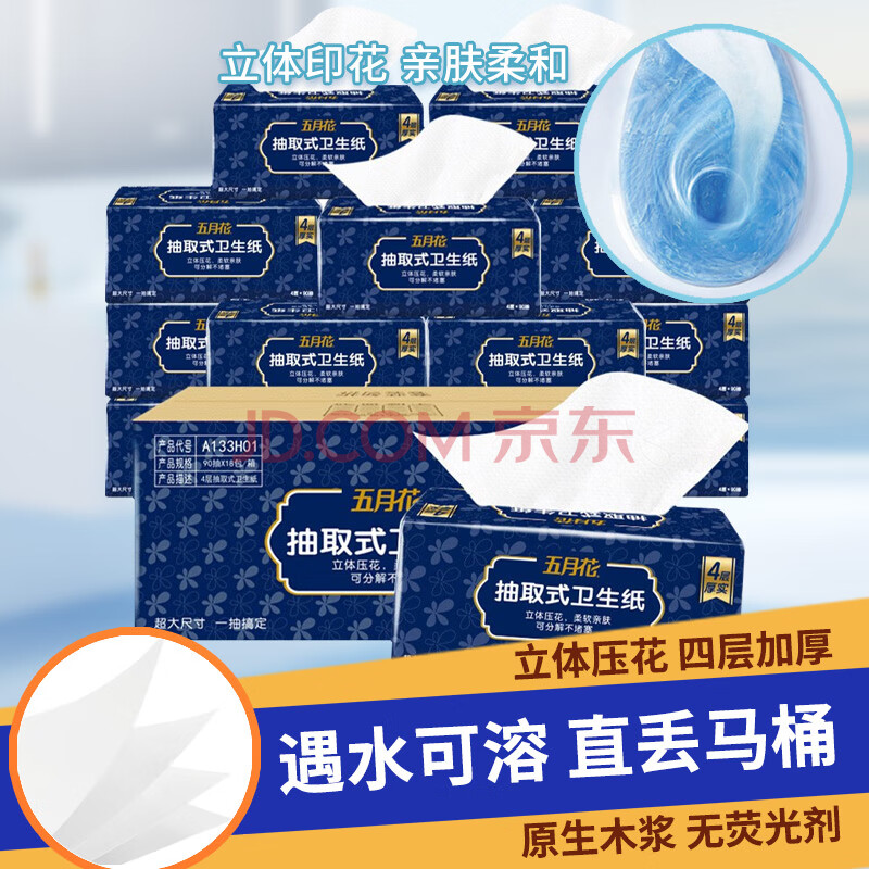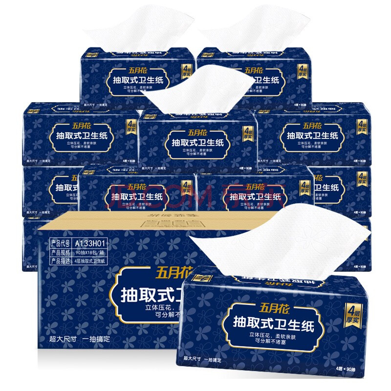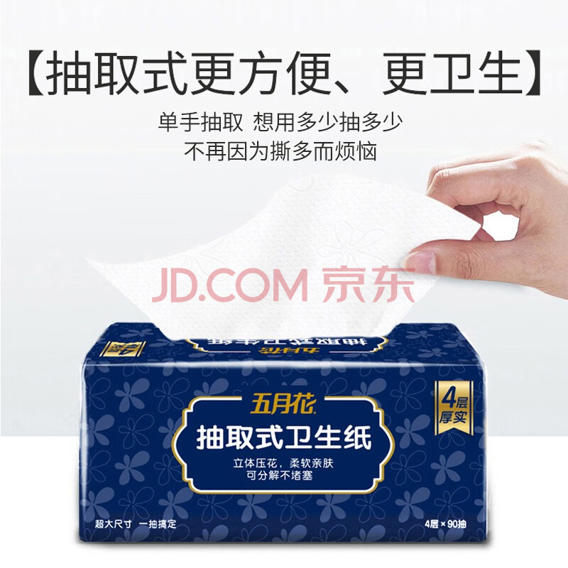 商品相册:五月花(May Flower)卫生纸 4层90抽*18包抽取式厕所用纸易溶水可直接冲马桶 整箱售第