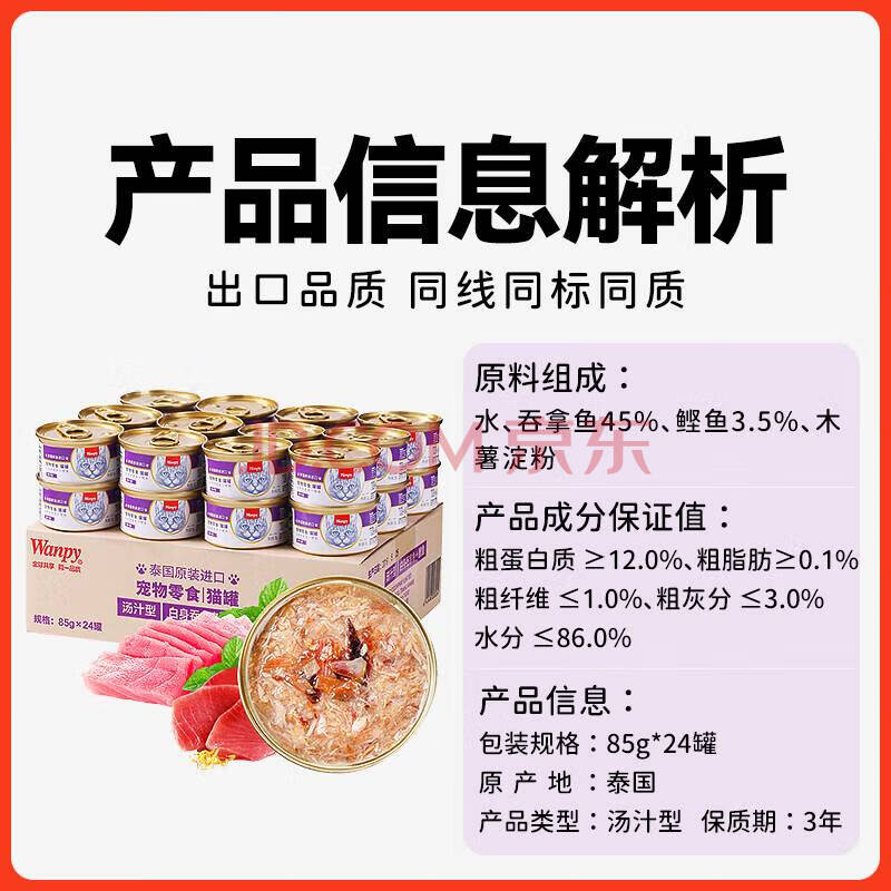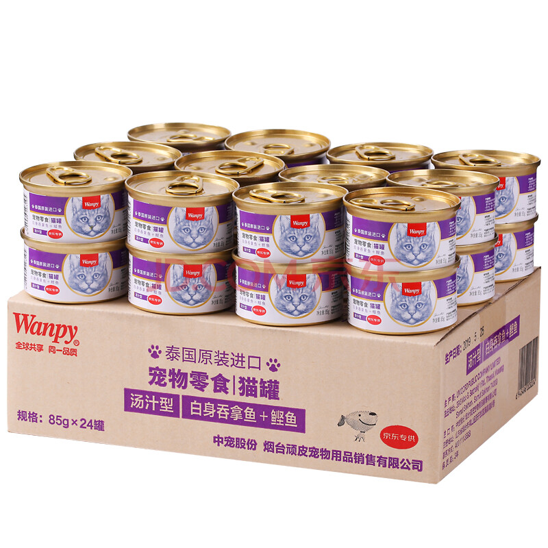 商品相册:顽皮(Wanpy)泰国进口 猫罐头85g*24罐 白身吞拿鱼+鲣鱼罐头(汤汁型) 成猫零食第