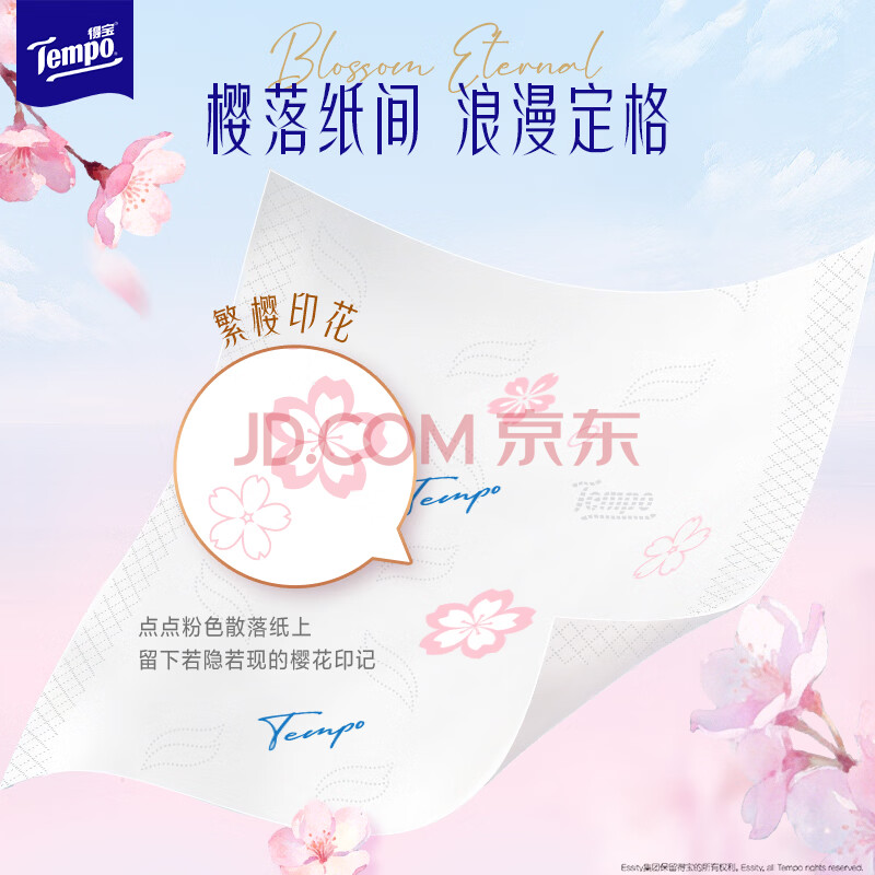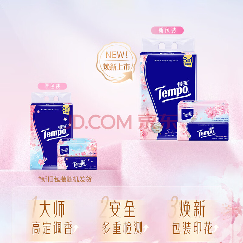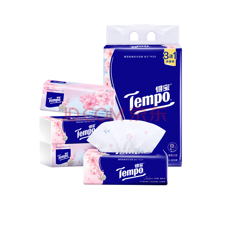 商品相册:得宝(TEMPO)一博同款 抽纸 樱花味4层90抽*4包 湿水不易破 餐巾纸 卫生纸第