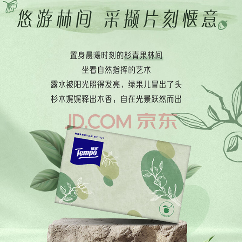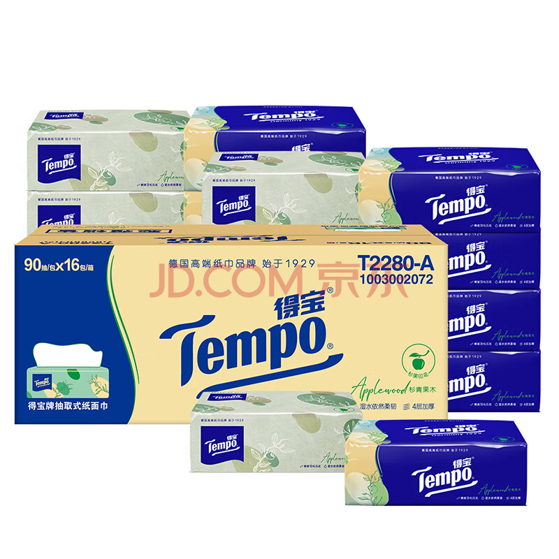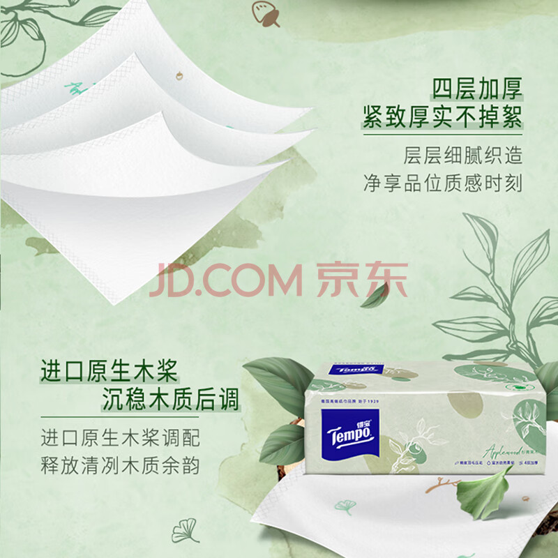 商品相册:得宝(TEMPO)一博同款 抽纸 真M码 杉青果木味4层90抽*16包 湿水不易破 纸巾第
