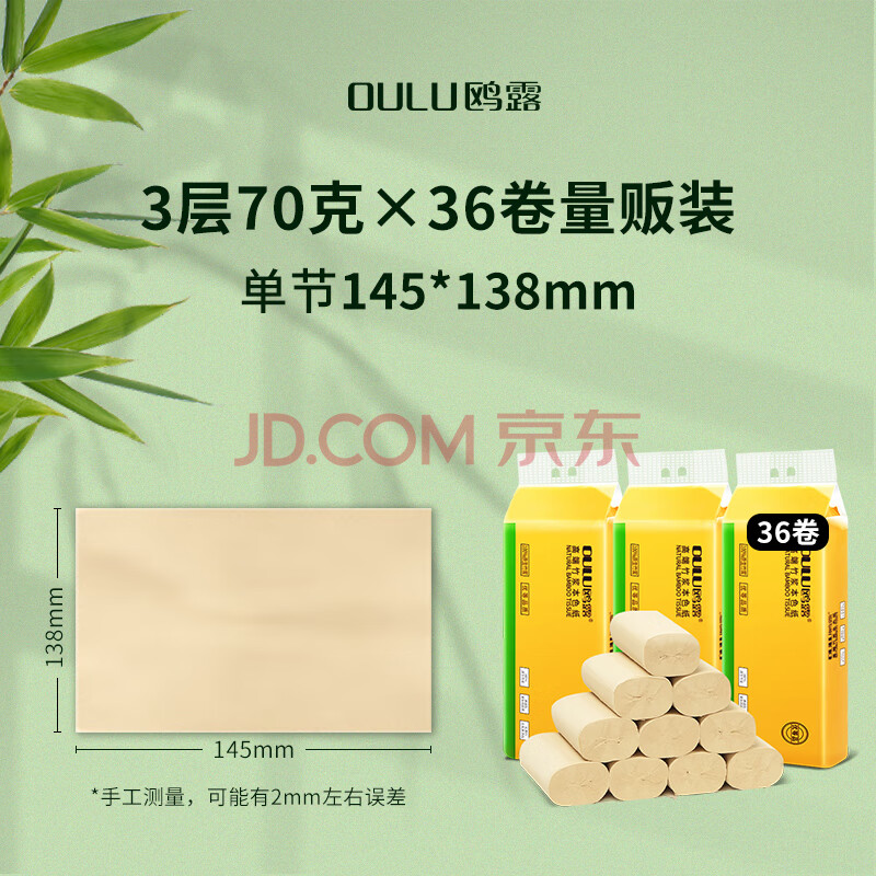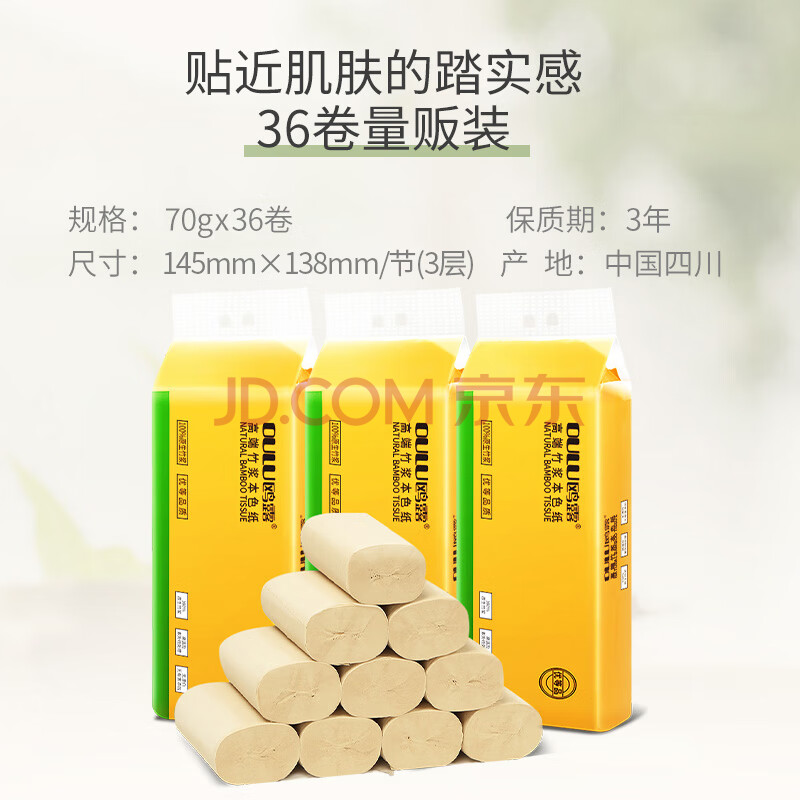 商品相册:鸥露(OULU)无芯卷纸 3层70g*36卷 卫生纸厕纸 纸巾无漂白手纸竹浆本色纸整箱第