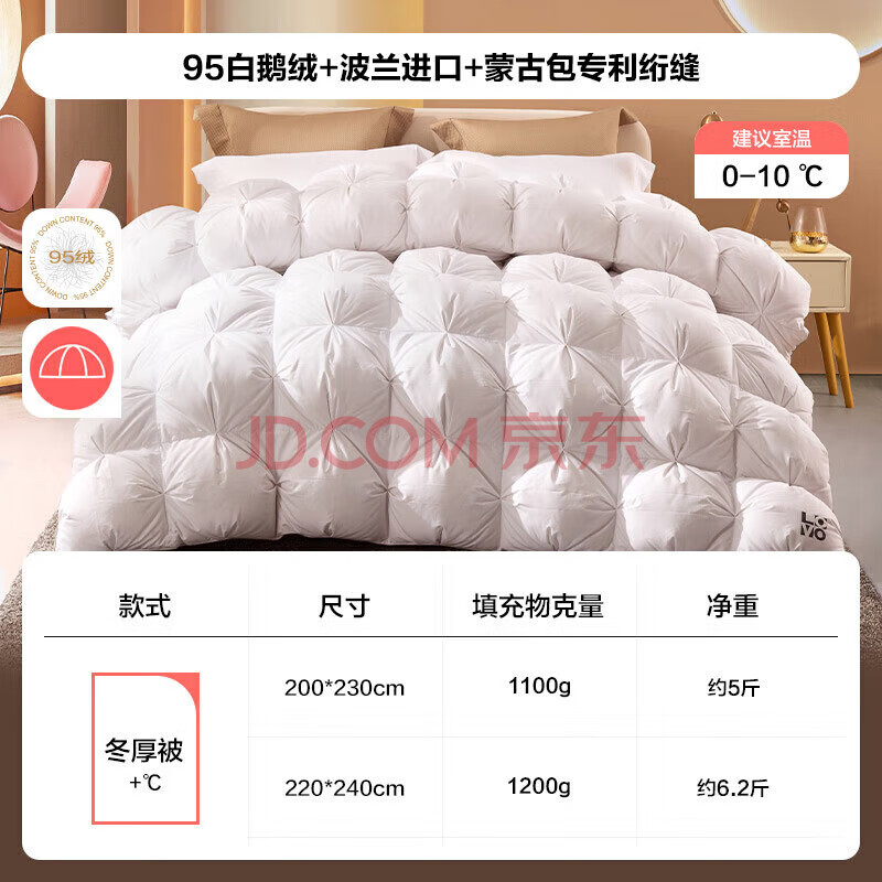 商品相册:LOVO罗莱 95%白鹅绒 欧洲进口 冬被 1100g填充 200*230cm 白色第