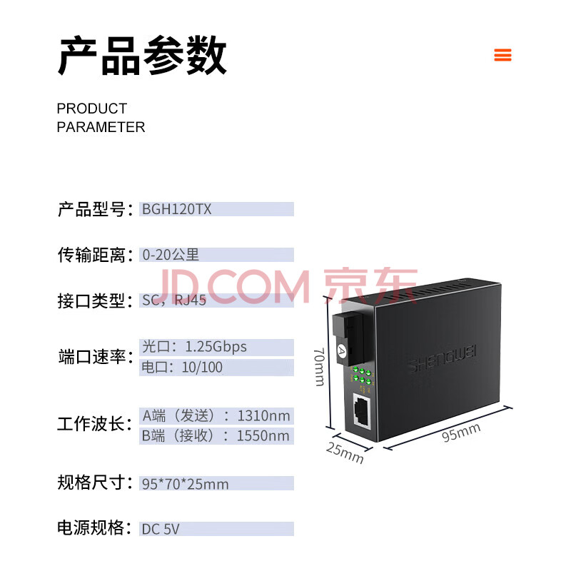 商品相册:胜为(shengwei)BGH120TX 光纤收发器 百兆单模单纤光电转换器 SC接口20KM公里一对装第