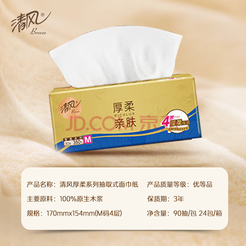 商品相册:清风抽纸 厚柔4层90抽24包M码 可湿水卫生纸 餐巾纸 纸抽 整箱纸巾第