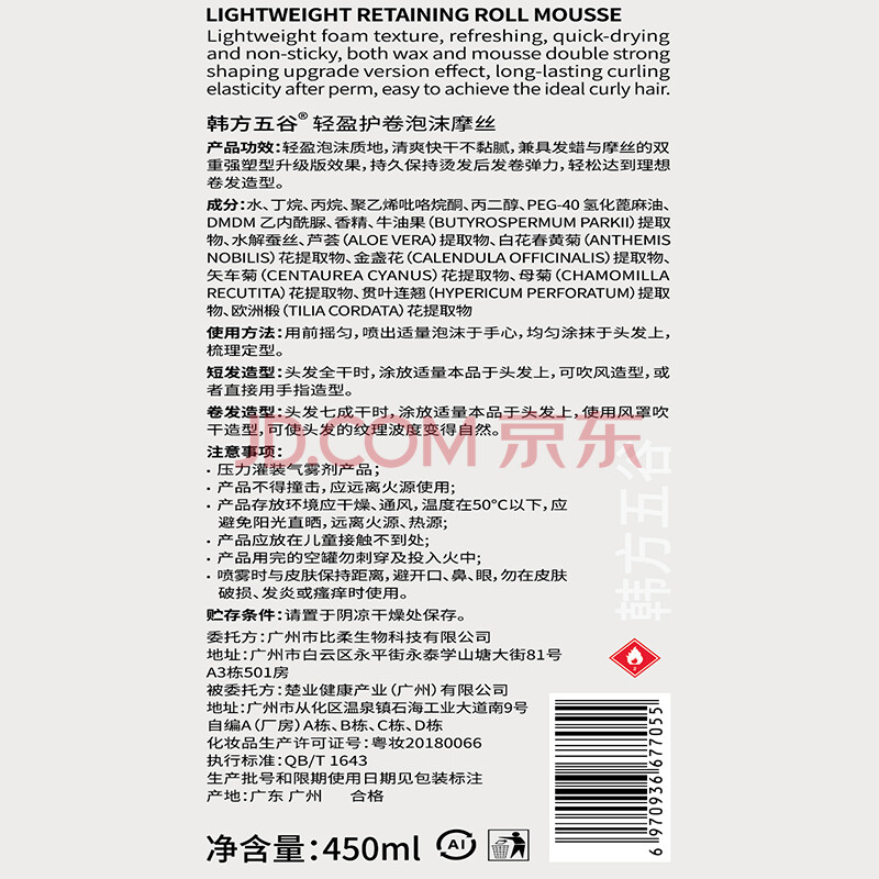 商品相册:韩方五谷泡沫发蜡弹力护卷摩丝烫卷发喷雾保湿定型蓬松弹力素男女士450ml第