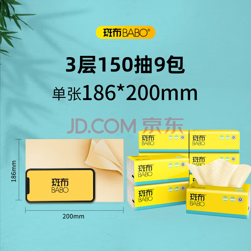 商品相册:斑布抽纸 3层150抽*9包L码 原生竹浆 湿水不易破 纸巾 卫生纸 整箱第
