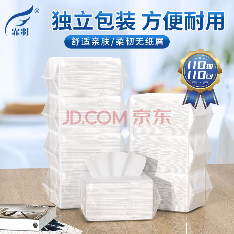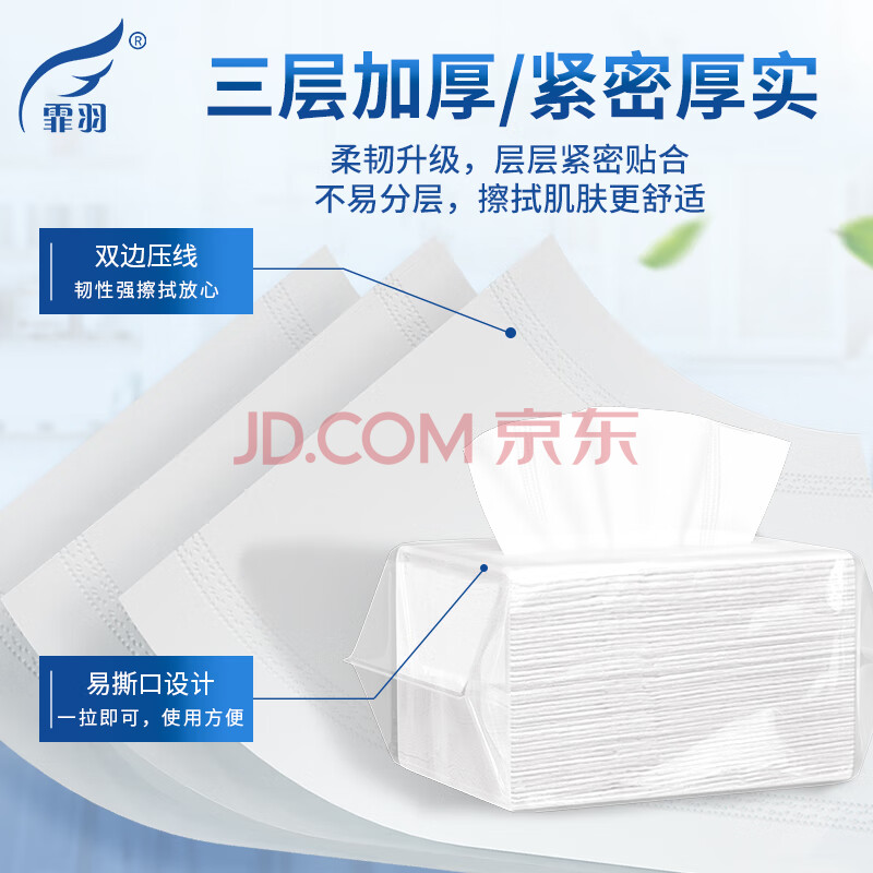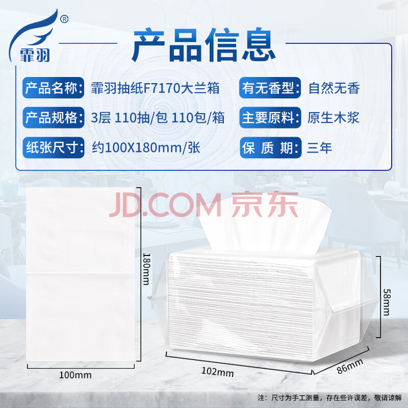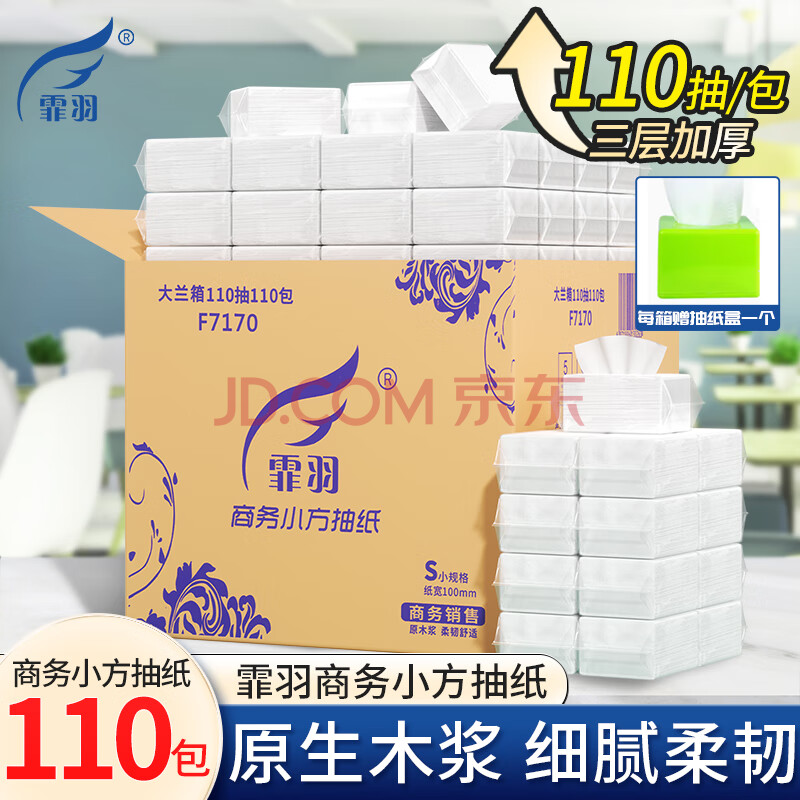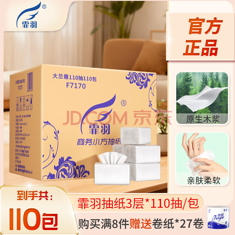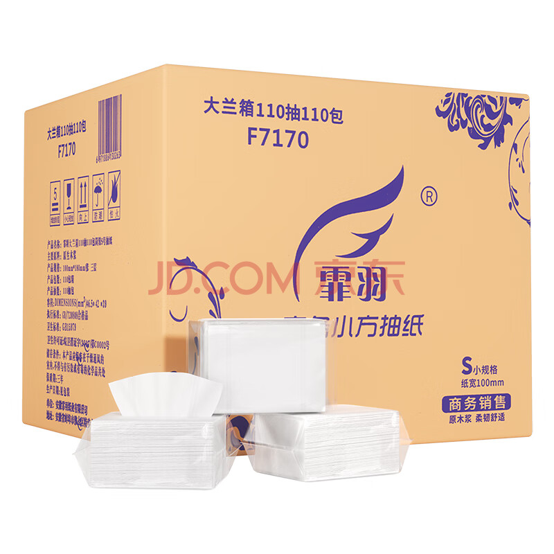 商品相册:霏羽小方抽纸3层110抽*110包 客房酒店餐饮饭店餐巾纸巾大兰箱7170第