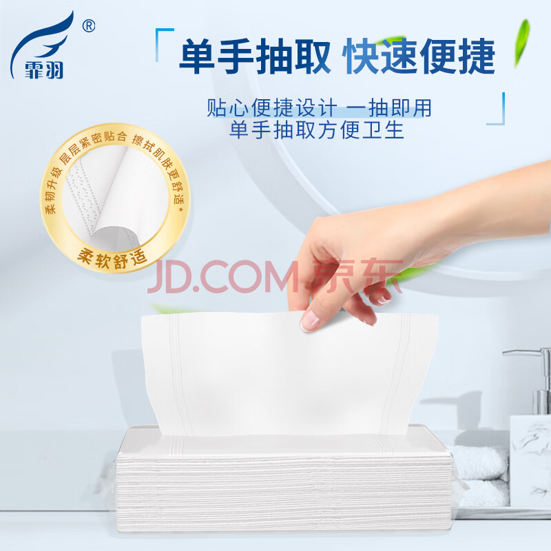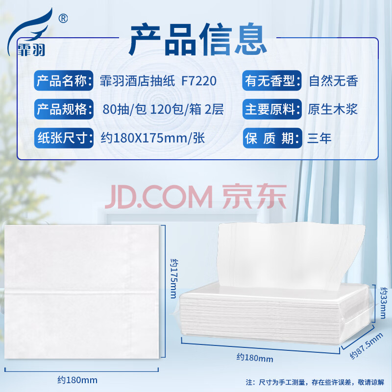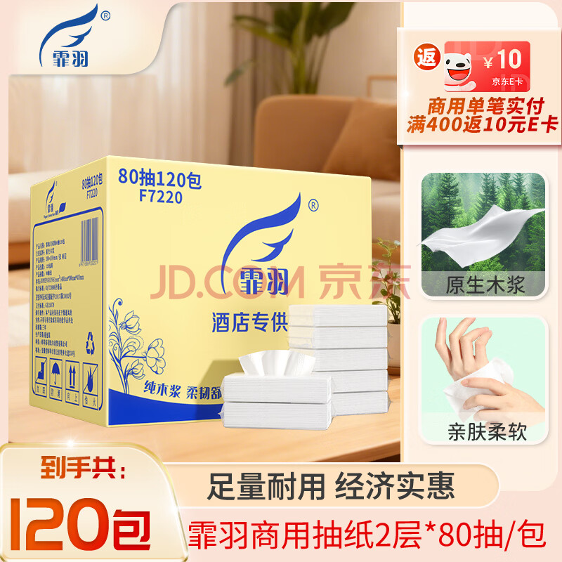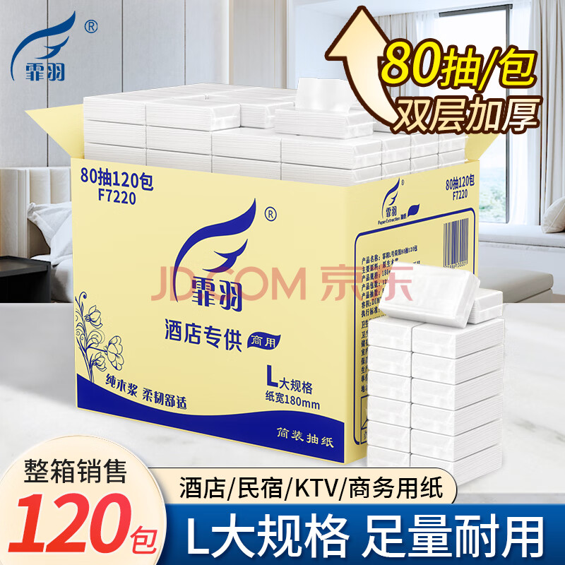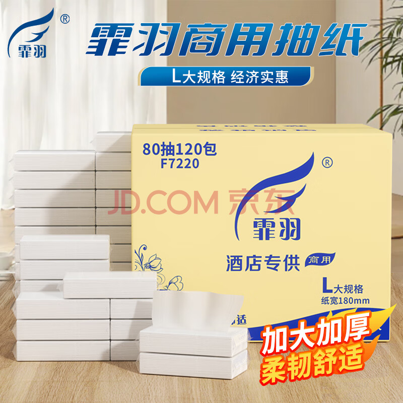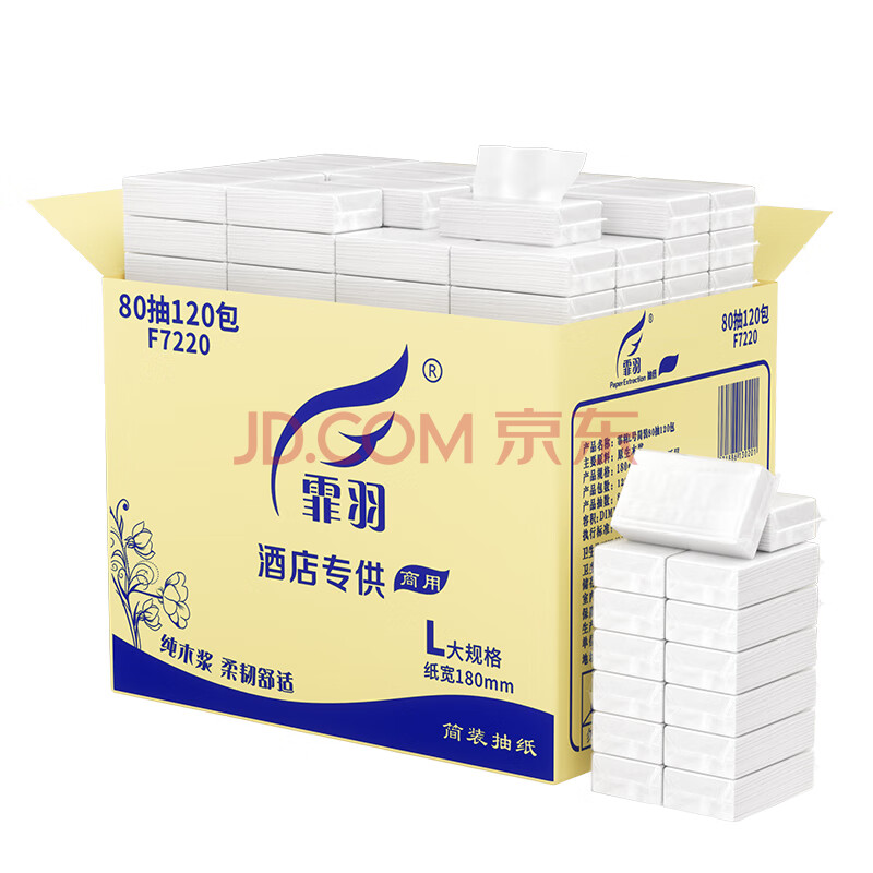 商品相册:霏羽抽纸2层80抽*120包商用面巾纸简装长款180*175mm餐巾纸整箱F7220第