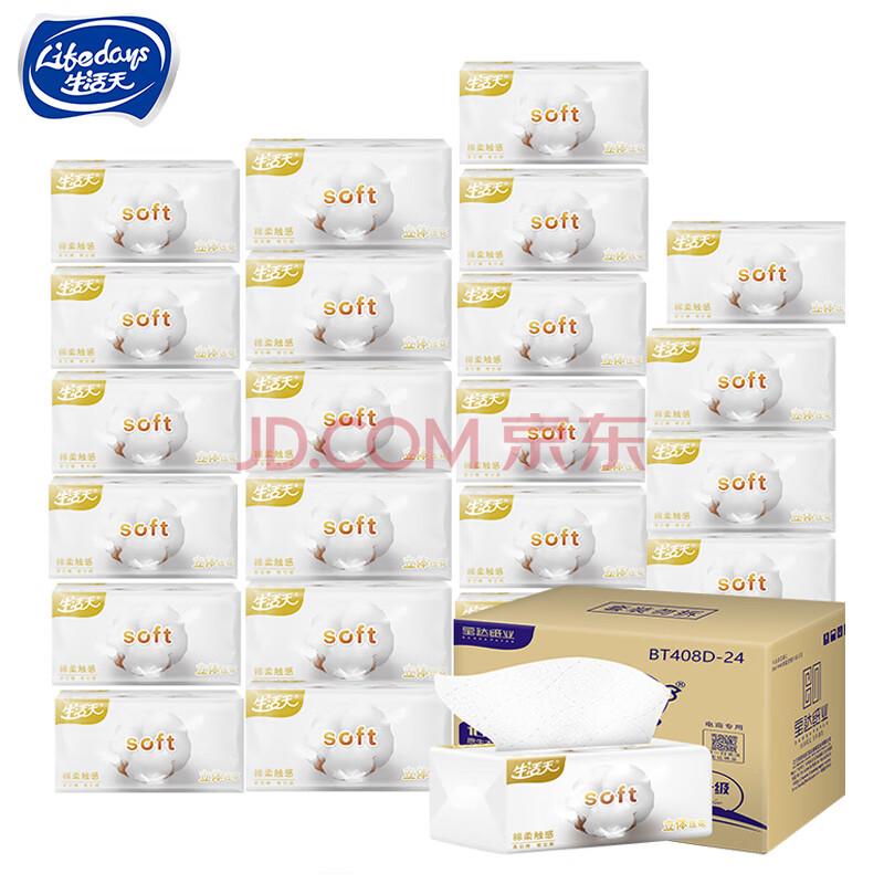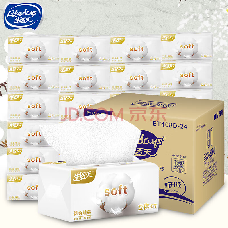 商品相册:生活天 Lifedays 抽纸 棉柔4层85抽*24包 亲肤无刺激餐巾纸卫生纸巾整箱第