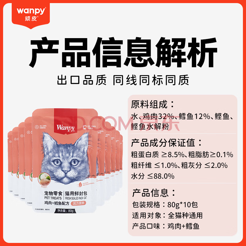 商品相册:顽皮(Wanpy)猫零食鸡肉鳕鱼鲜封包800g(80g*10包)猫湿粮成幼猫咪零食第