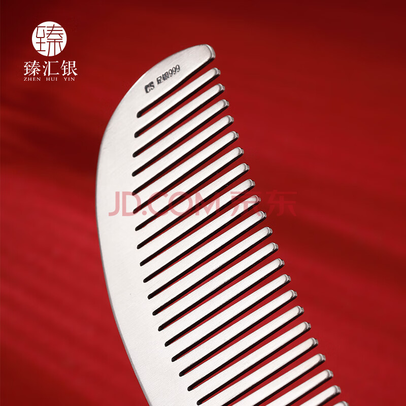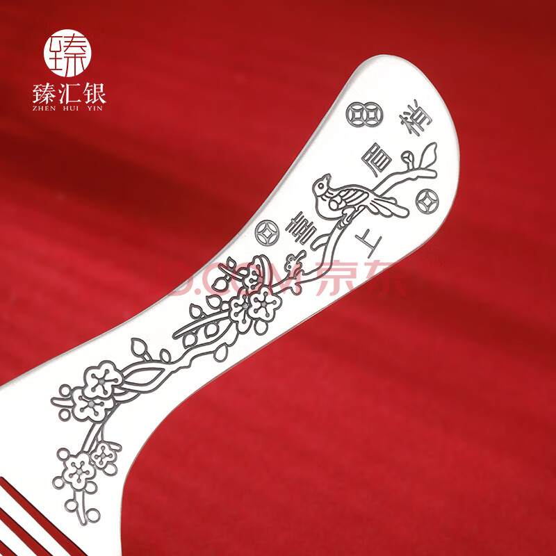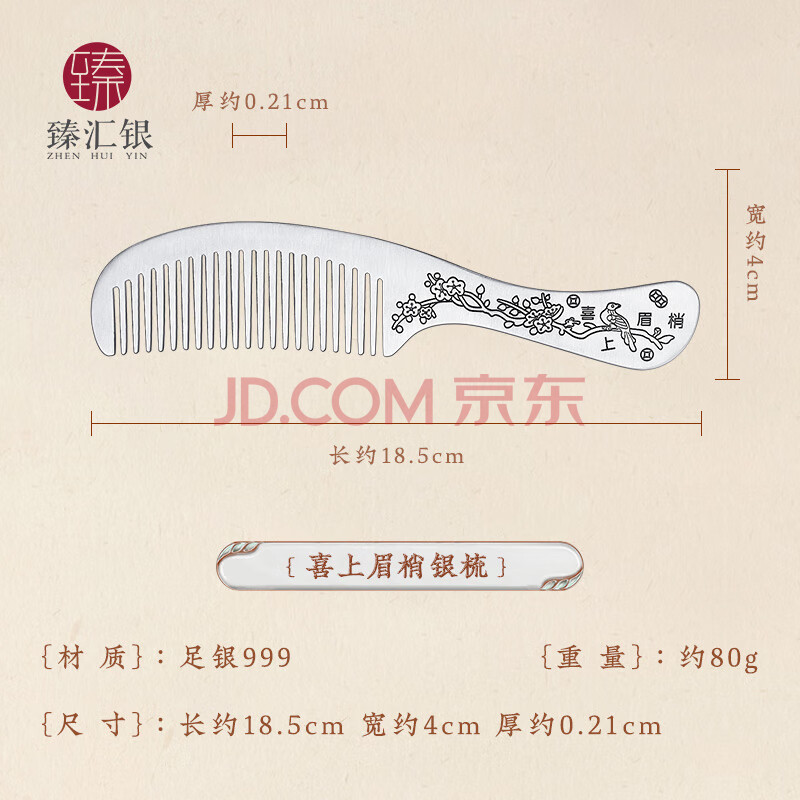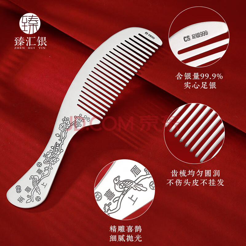 商品相册:臻汇银999足银梳子喜上眉梢长柄雪花银母亲节生日礼物送女友约80g第