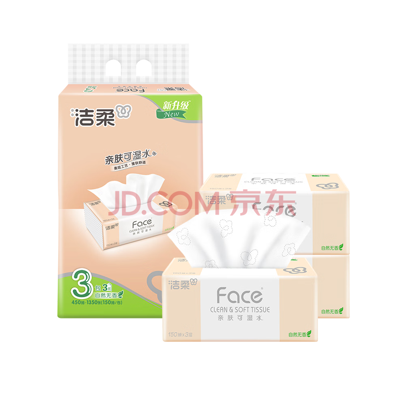 商品相册:洁柔抽纸 粉Face可湿水3层150抽*3包 校园必备 大规格M码面巾纸第