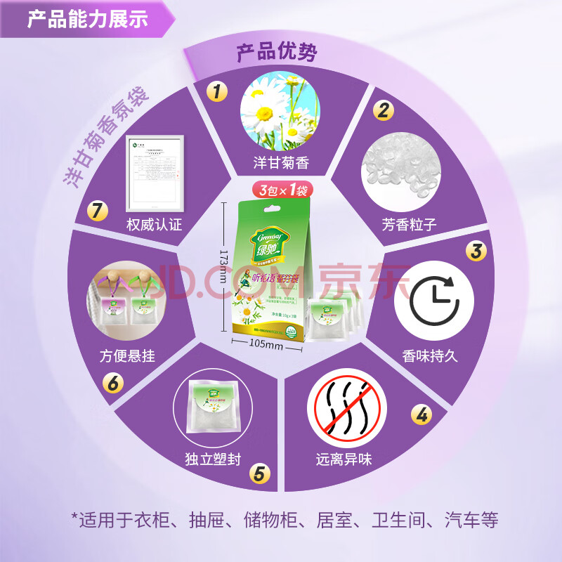 商品相册:绿驰 洋甘菊香氛袋10g*3衣物柜空气清新剂去除臭异味膏汽车芳香薰囊包第