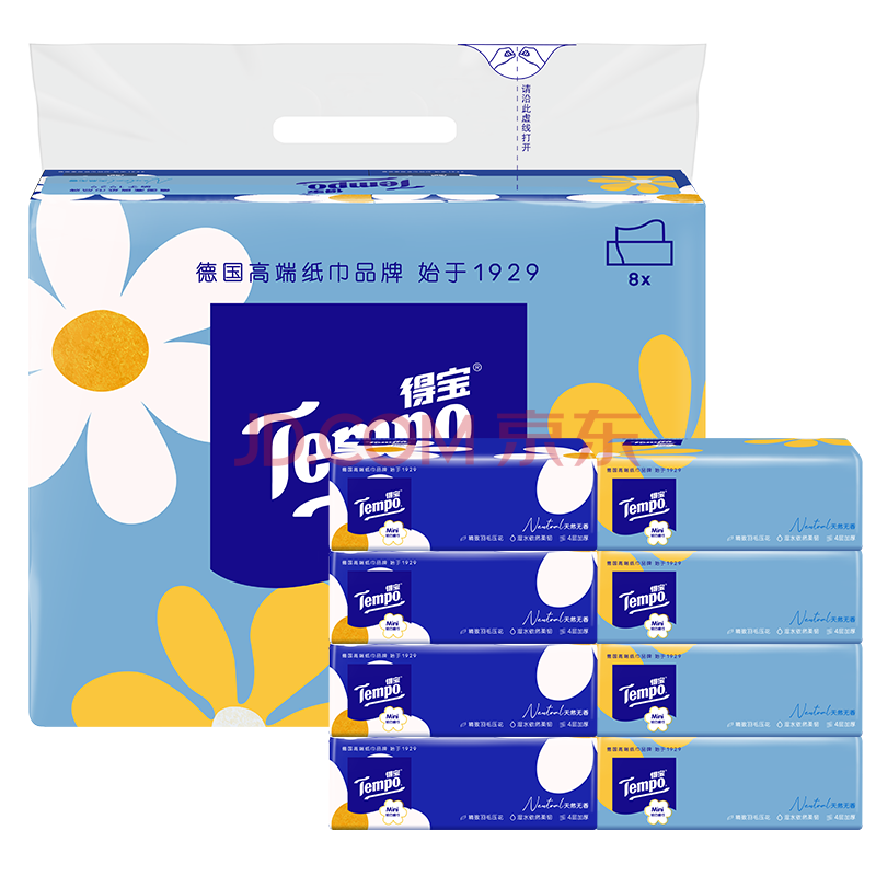 商品相册:得宝(TEMPO)一博同款 抽纸 小雏菊系列4层80抽*8包 湿水不易破 餐巾纸 卫生纸第