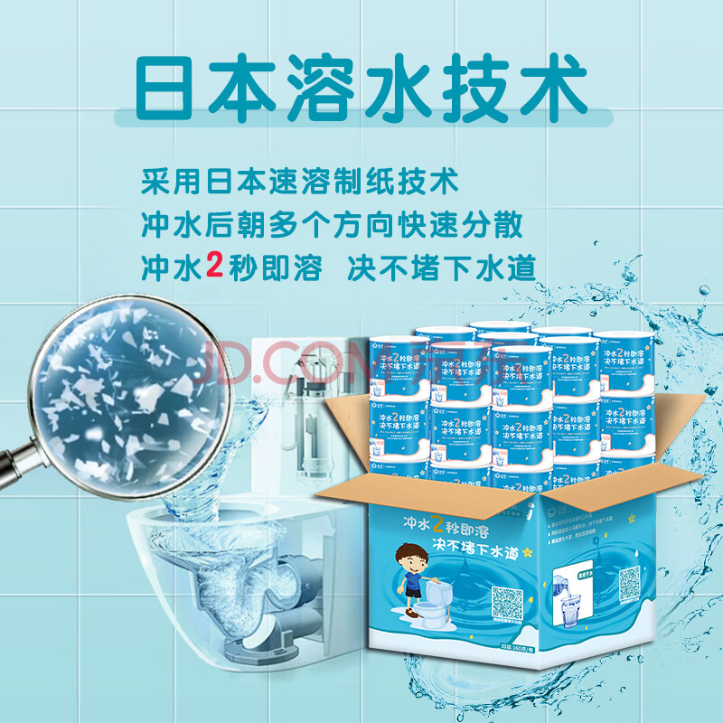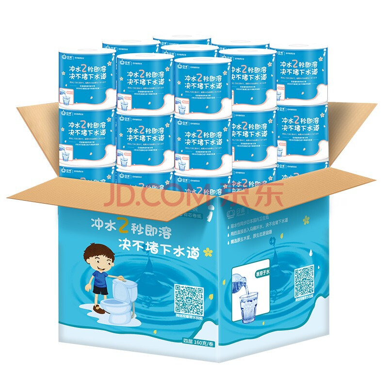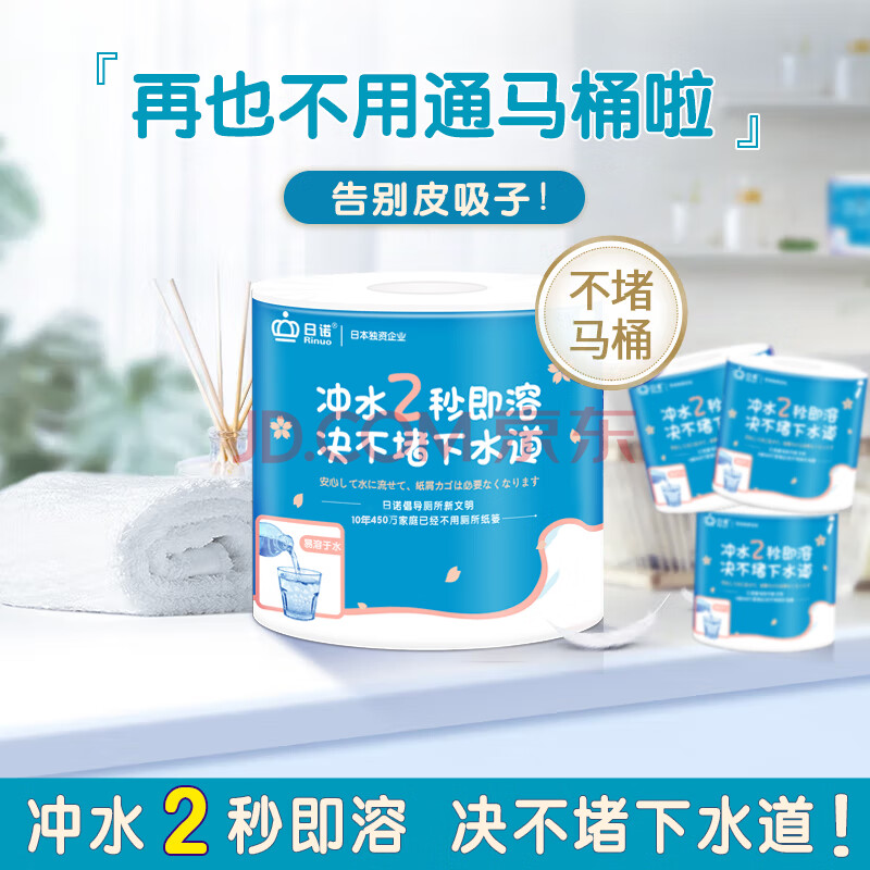 商品相册:日诺(Rinuo)水溶卫生纸可溶水卷纸融水有芯卷筒纸厕纸巾4层160克整箱27卷第