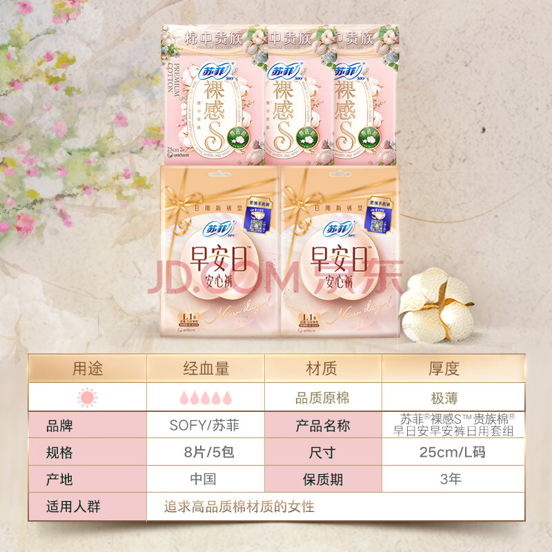 商品相册:苏菲日用旅行试用装(裸感S贵族棉25cm2片*3+魔术贴早安裤L码1条*2)第