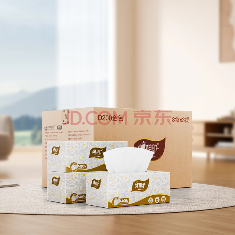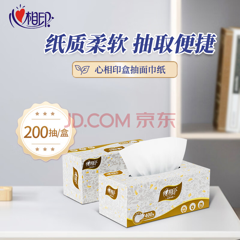 商品相册:心相印盒装抽纸2层200抽*9盒面巾纸餐巾纸硬长款商务用纸3提 D200第