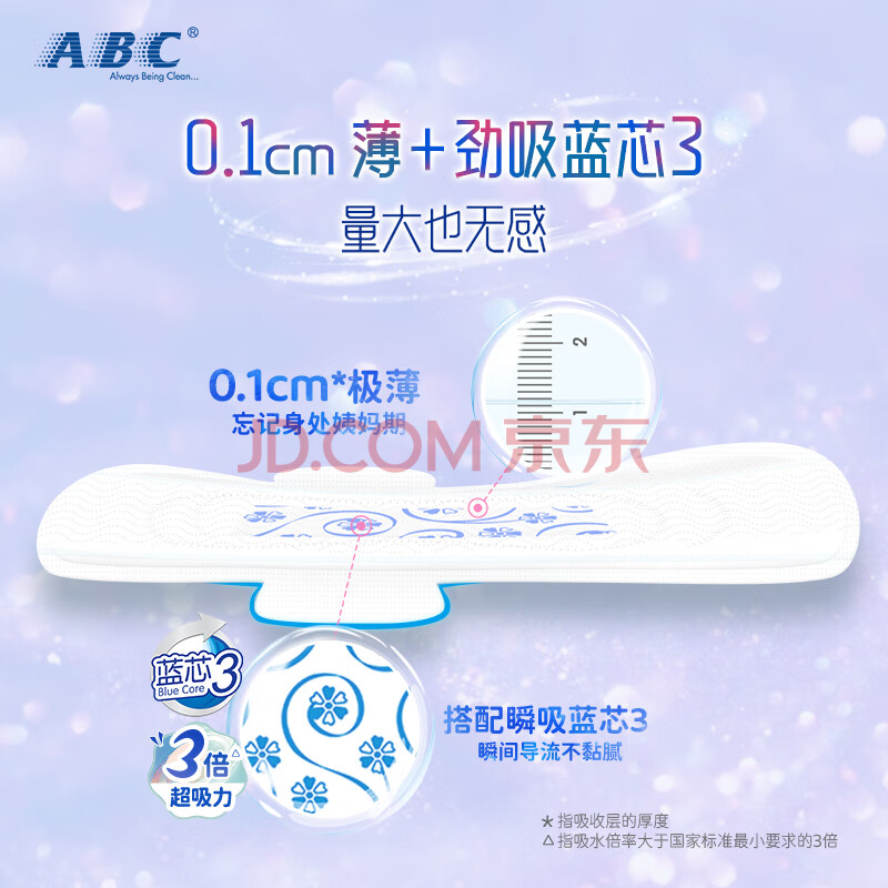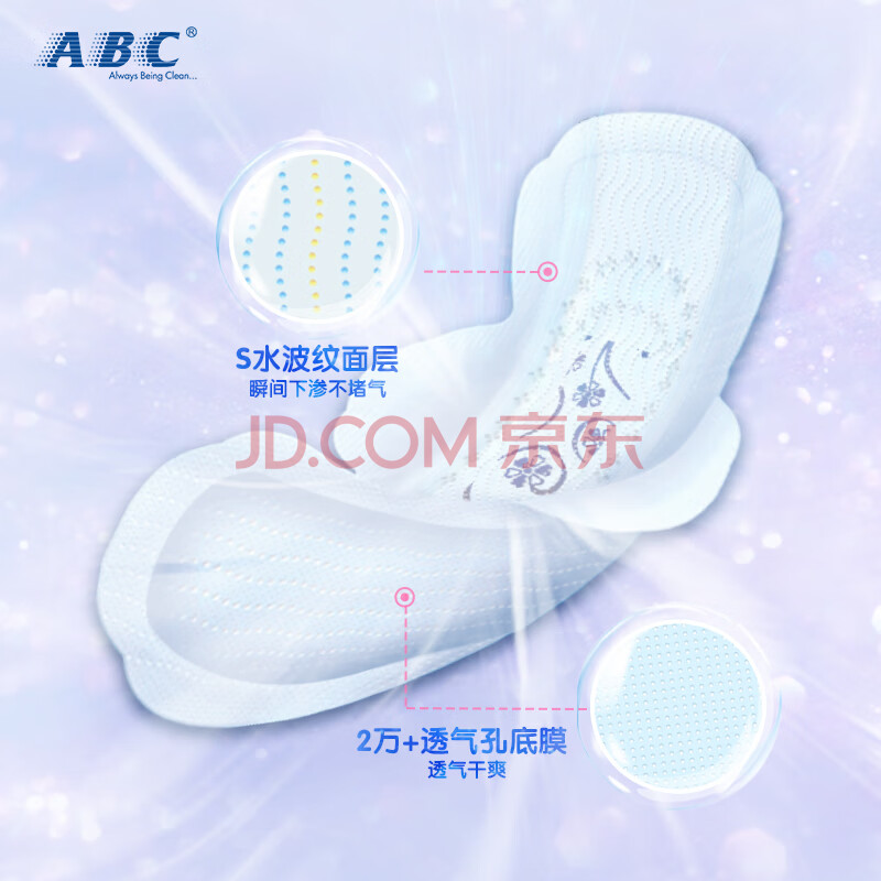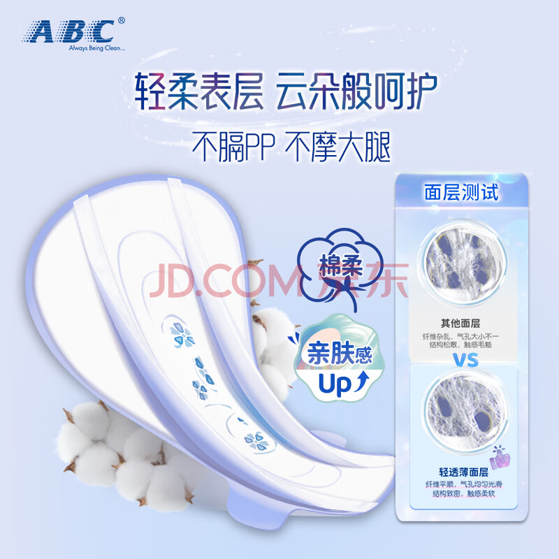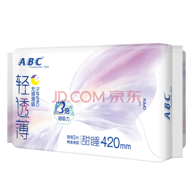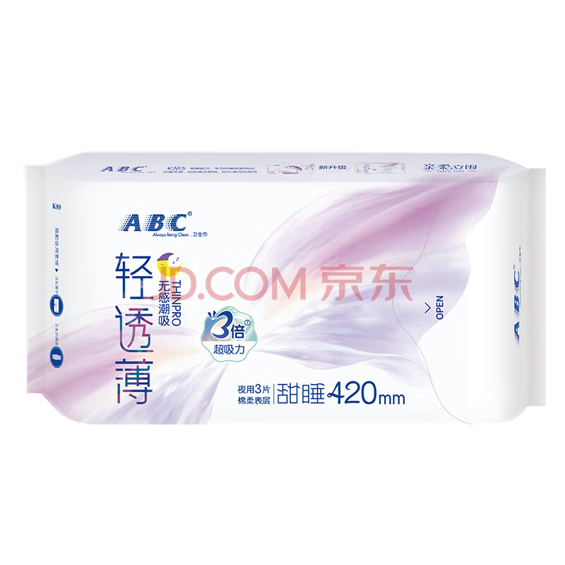 商品相册:ABC亲柔立围KMS健康配方超薄透气加长夜用卫生巾京东自营420mm*9片第