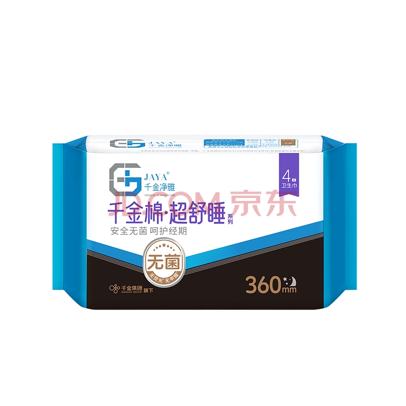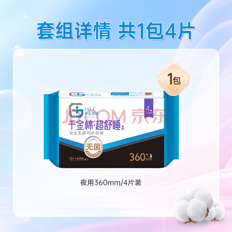 商品相册:千金净雅超熟睡纯棉透气超长夜用卫生巾360mm*4片*1包京东自营姨妈巾消毒第