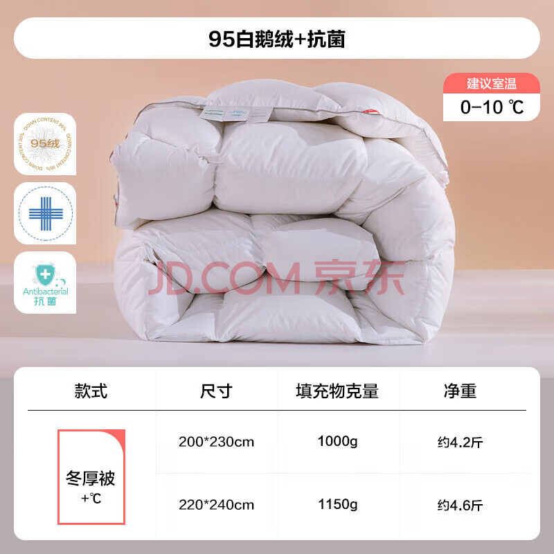 商品相册:LOVO罗莱家纺 95%白鹅绒羽绒被子 1150g填充220*240cm 白色第