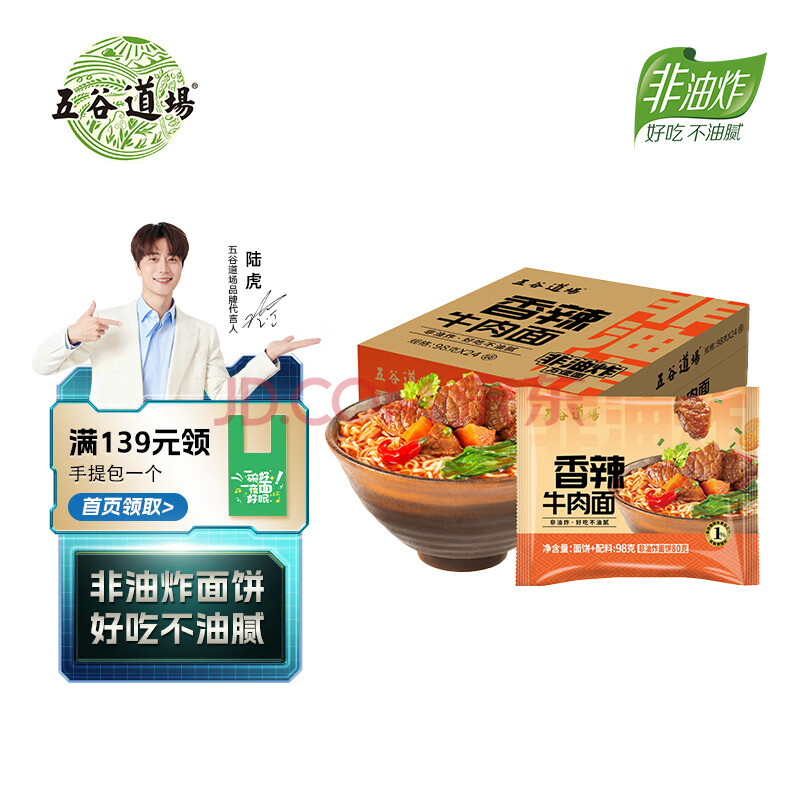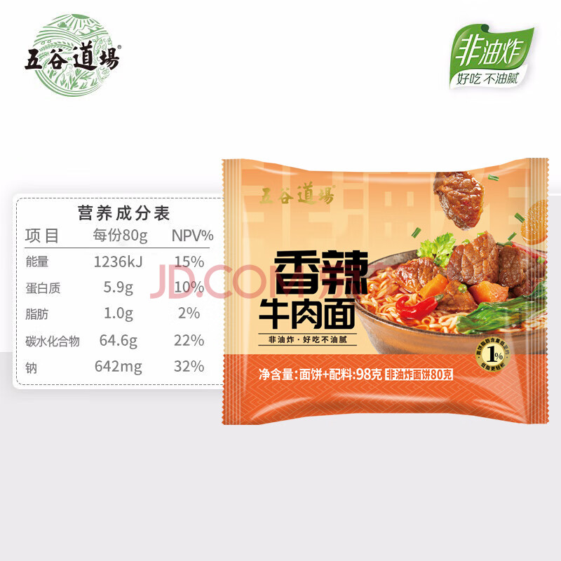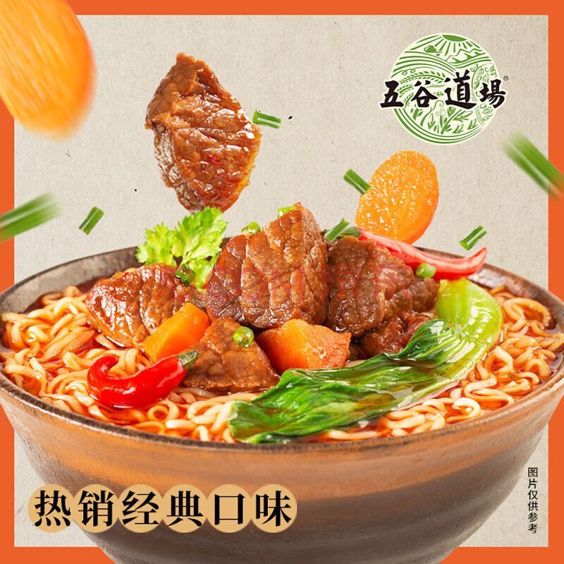 商品相册:五谷道場非油炸方便面香辣牛肉面98g*24袋装整箱 早餐泡面 第