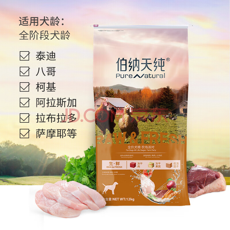商品相册:伯纳天纯生鲜1.0冻干全价通用犬粮农场派对(鸡肉+鸭肉+火鸡肉)12kg/24斤第