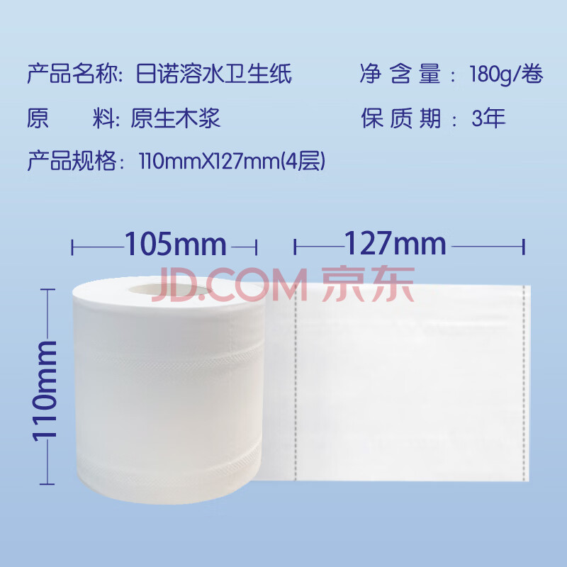 商品相册:日诺(Rinuo)水溶卫生纸可溶水卷纸融水有芯卷筒纸厕纸巾4层180克整箱27卷第