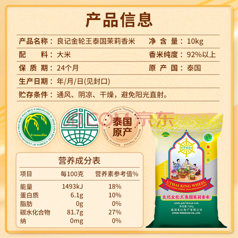 商品相册:良记金轮王 泰国茉莉香米20斤家庭装 原装进口 进口大米 清莱府长粒籼米第