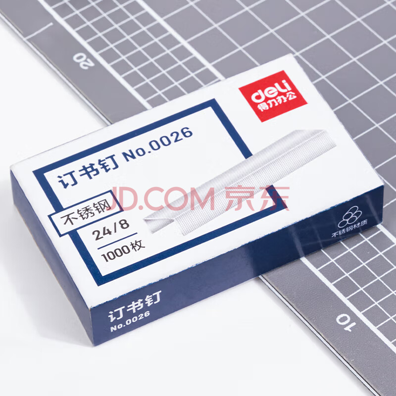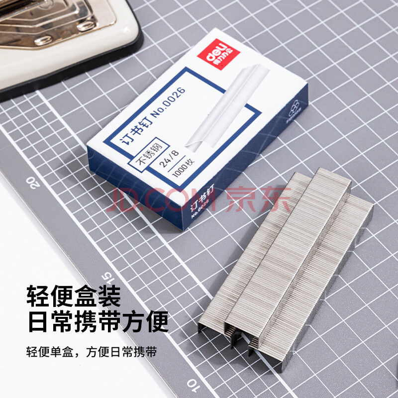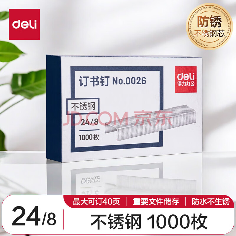 商品相册:得力(deli)24/8加厚不锈钢订书钉/订书针 1000枚/盒 单盒适用重要文件装订防锈不怕潮 可订40页 0026第