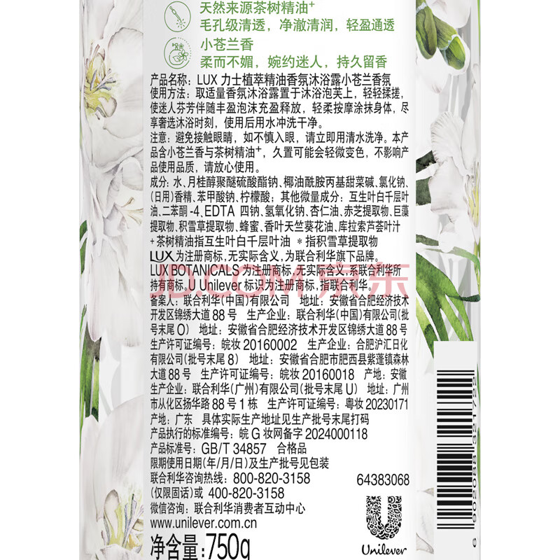 商品相册:力士(LUX)植萃精油香氛沐浴露小苍兰香与茶树精油750g 持久留香排浊净透第