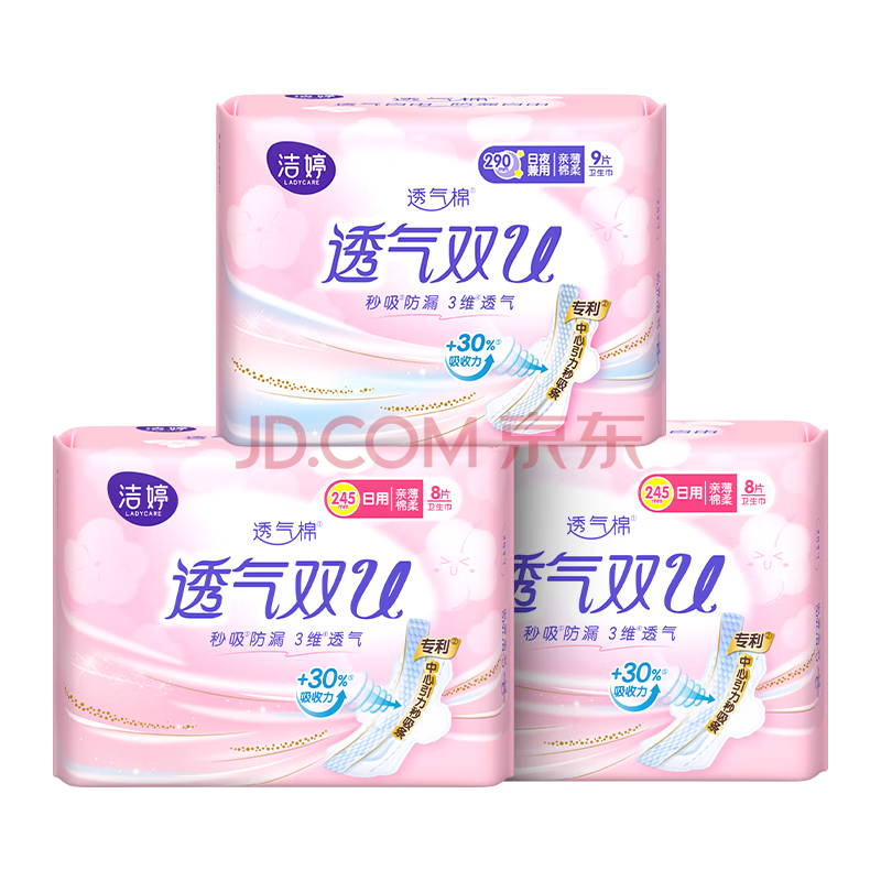 商品相册:洁婷日夜用卫生巾组合透气双U秒吸防漏姨妈巾3包25片京东自营官方旗舰第
