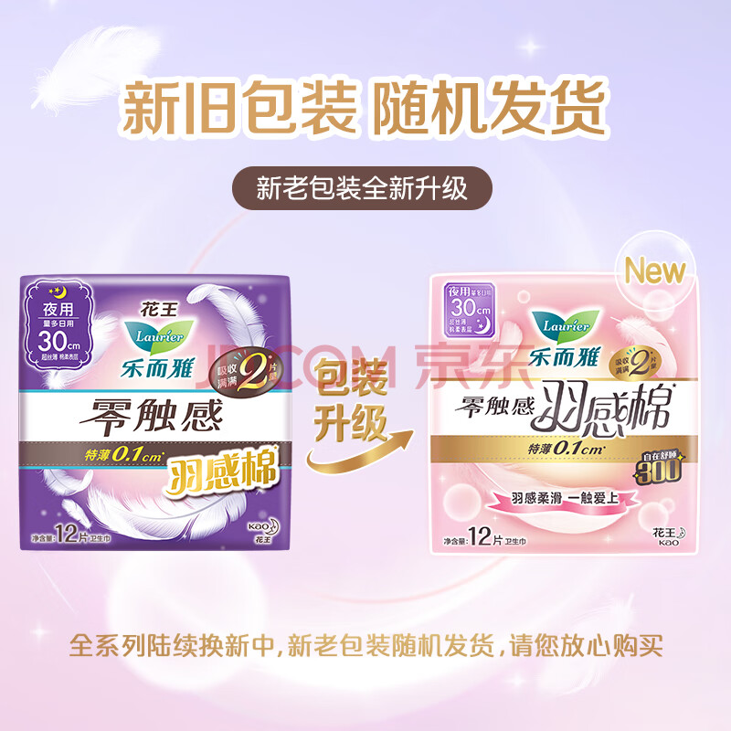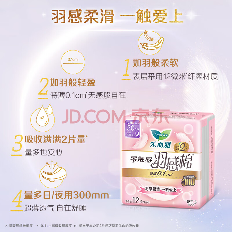 商品相册:乐而雅花王零触感羽感棉超丝薄护翼型夜用卫生巾30cm12片姨妈巾京东自营第