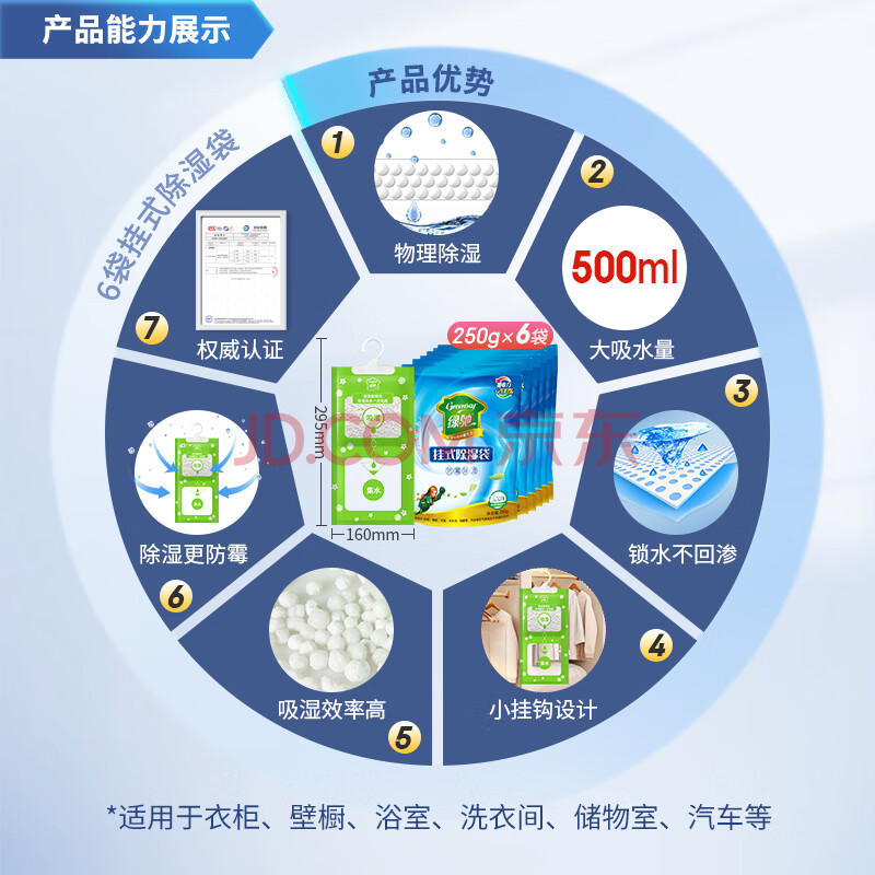 商品相册:绿驰 6袋可挂式除湿衣柜防霉潮干燥剂生石灰桶硅胶盒回南天抽水吸湿包第
