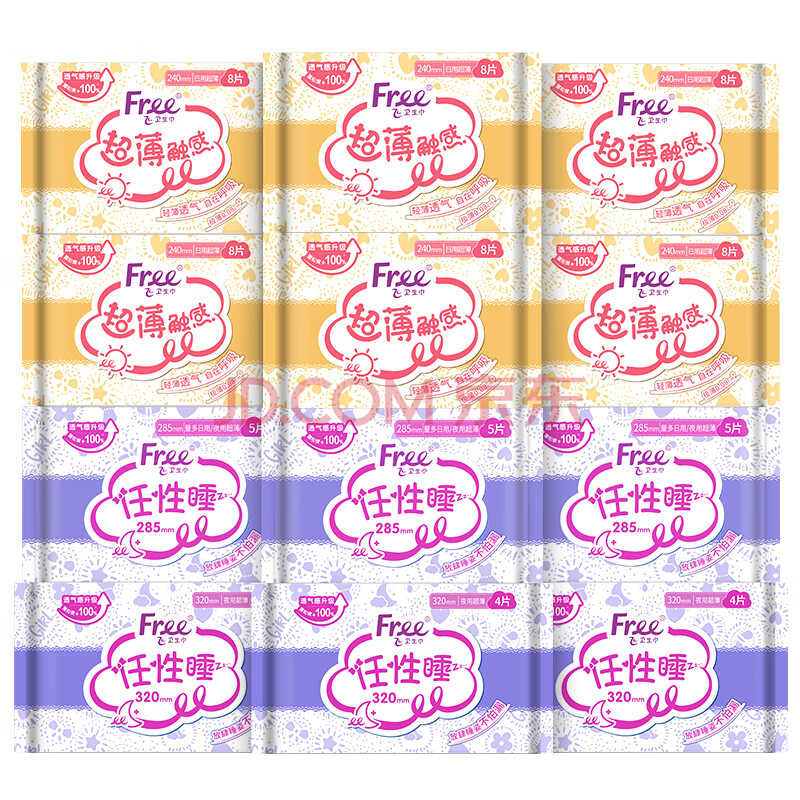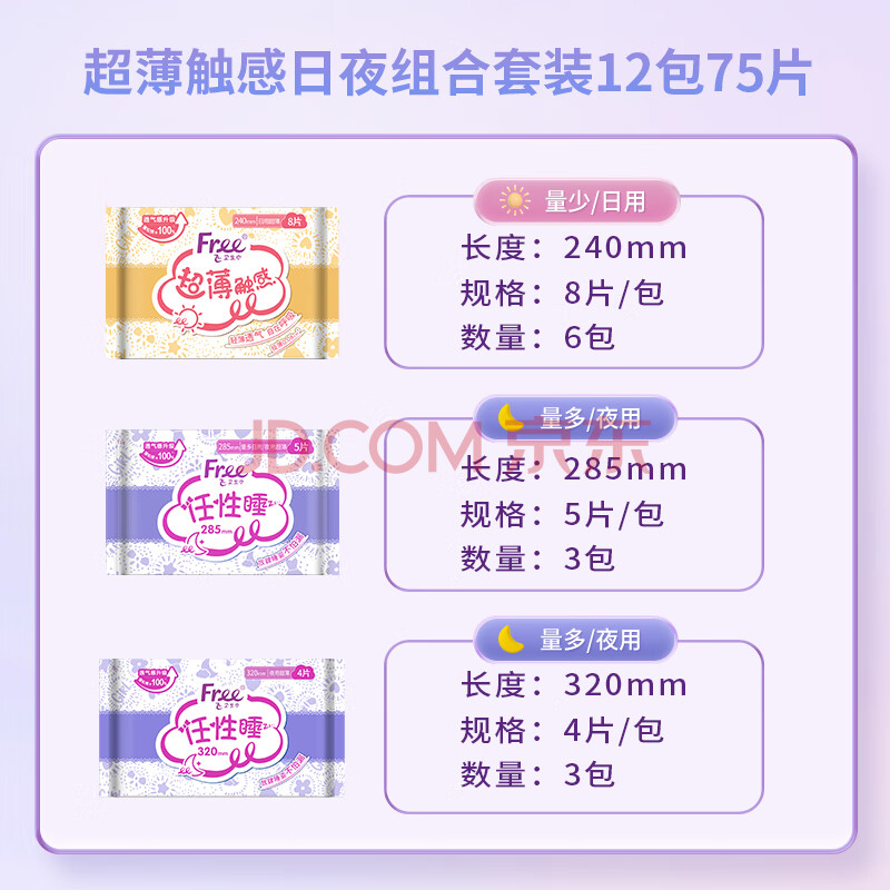 商品相册:FREE自营超薄触感卫生巾日夜组合套装12包75片(日用48片+夜用27片)第