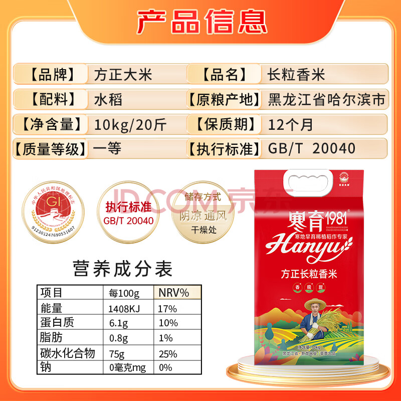商品相册:方正大米【2025年新米】长粒香米10kg/20斤 地标东北大米粳米家庭真空包装第