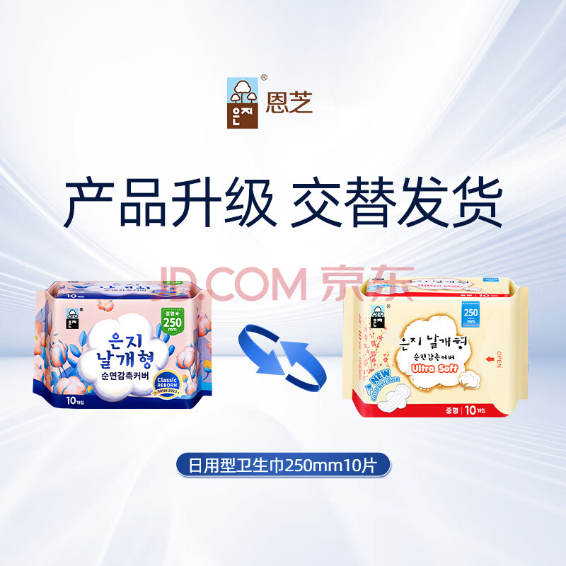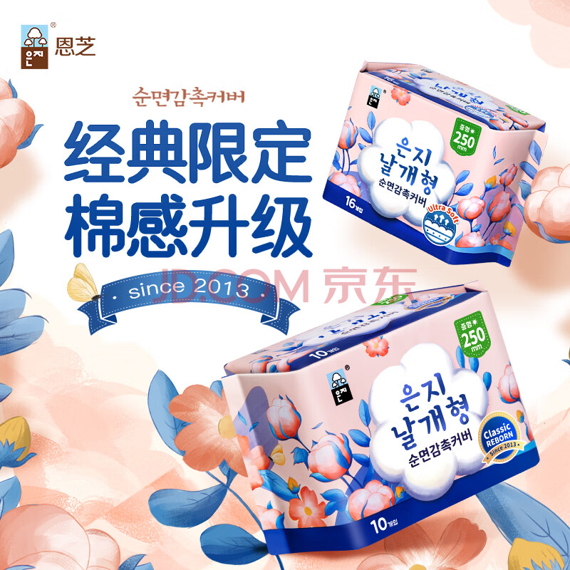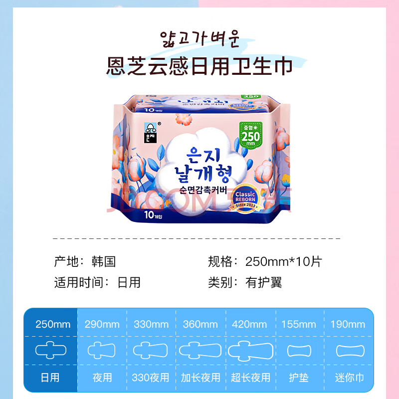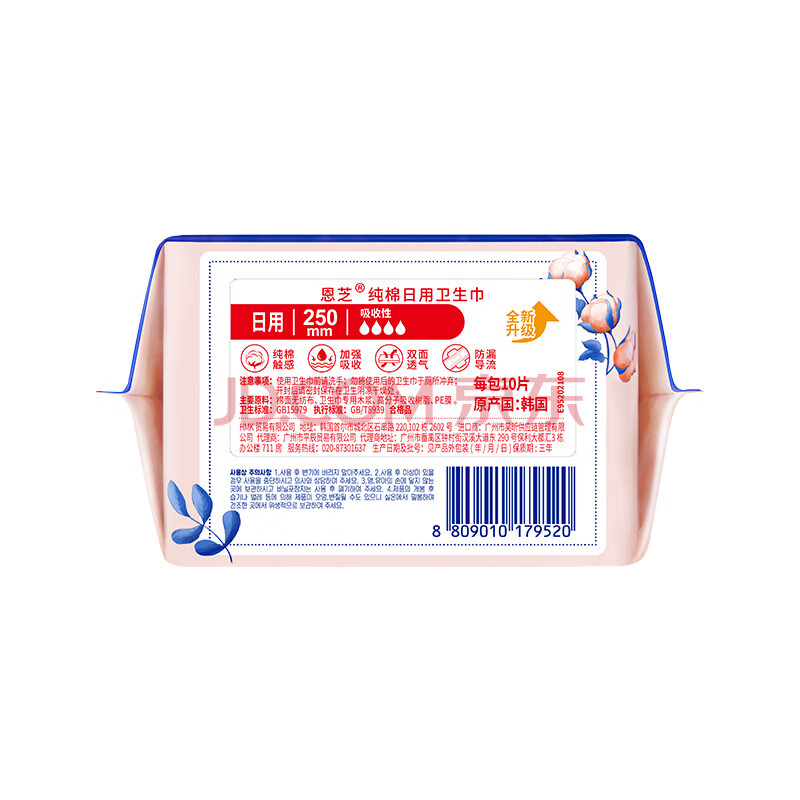 商品相册:恩芝韩国进口日用卫生巾250mm10片*3包 绵柔亲肤护翼型超薄瞬吸姨妈巾第