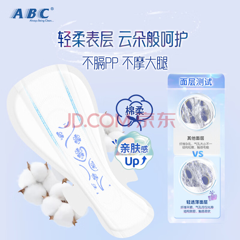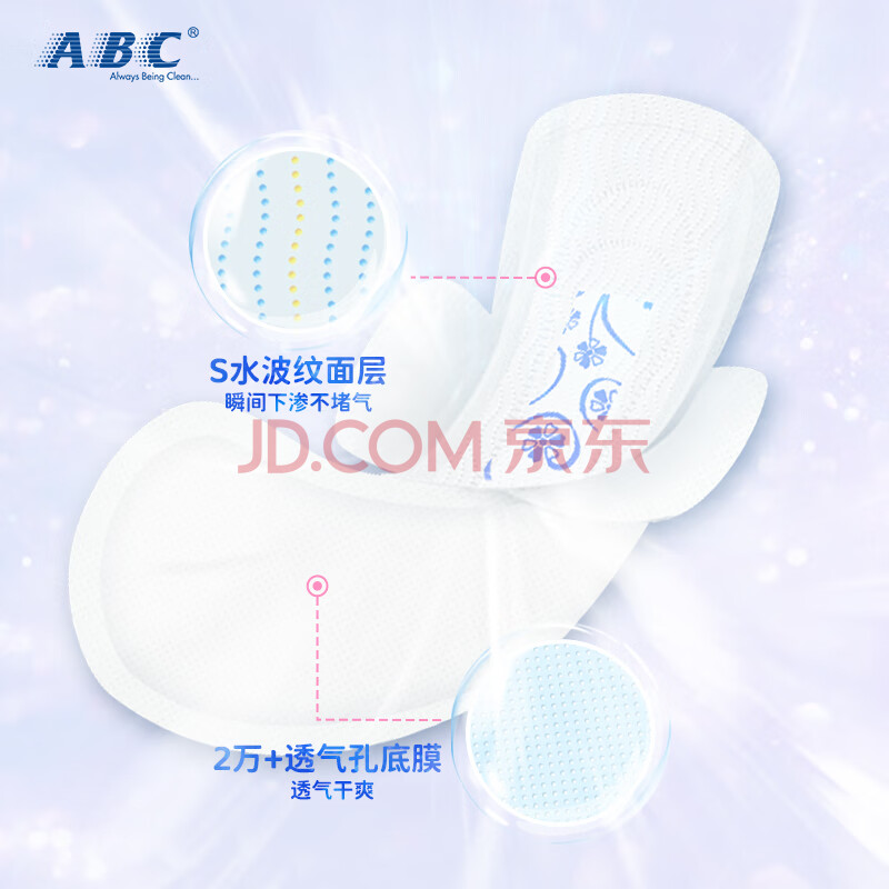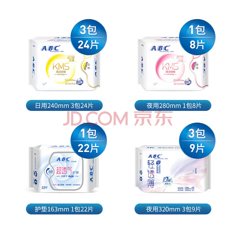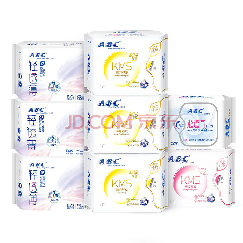 商品相册:ABCKMS纤薄健康配方超薄透气日夜卫生巾套装京东自营8包63片第