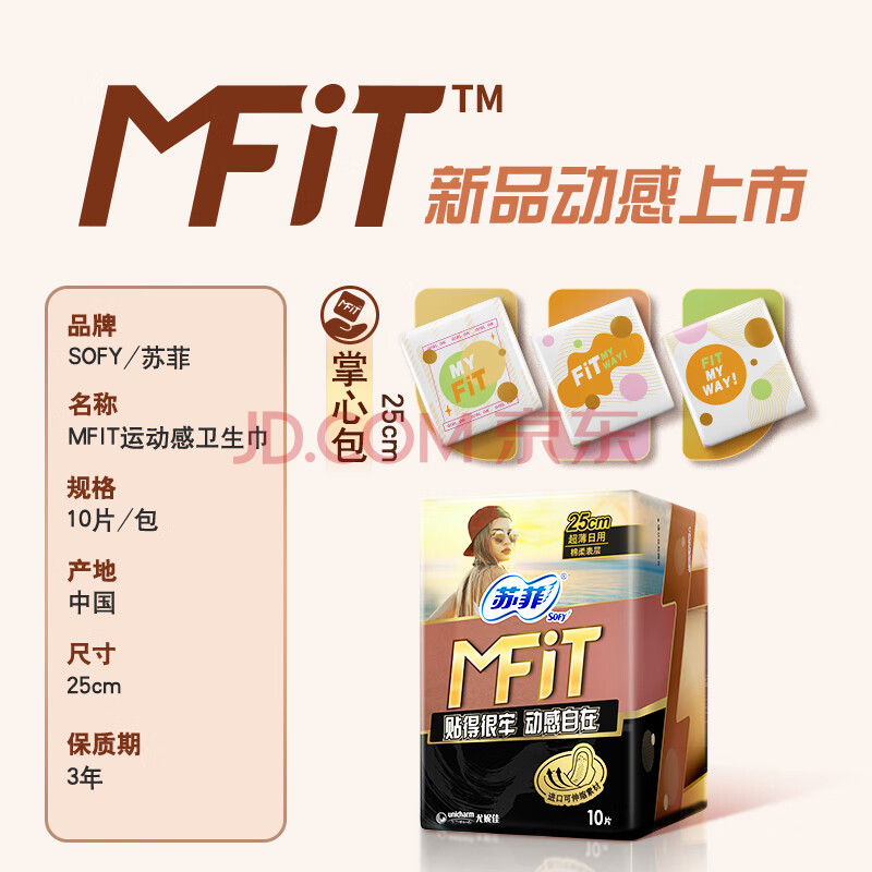 商品相册:苏菲MFIT运动感贴合不移位日用卫生巾250mm 10片 超薄透气姨妈巾自营第