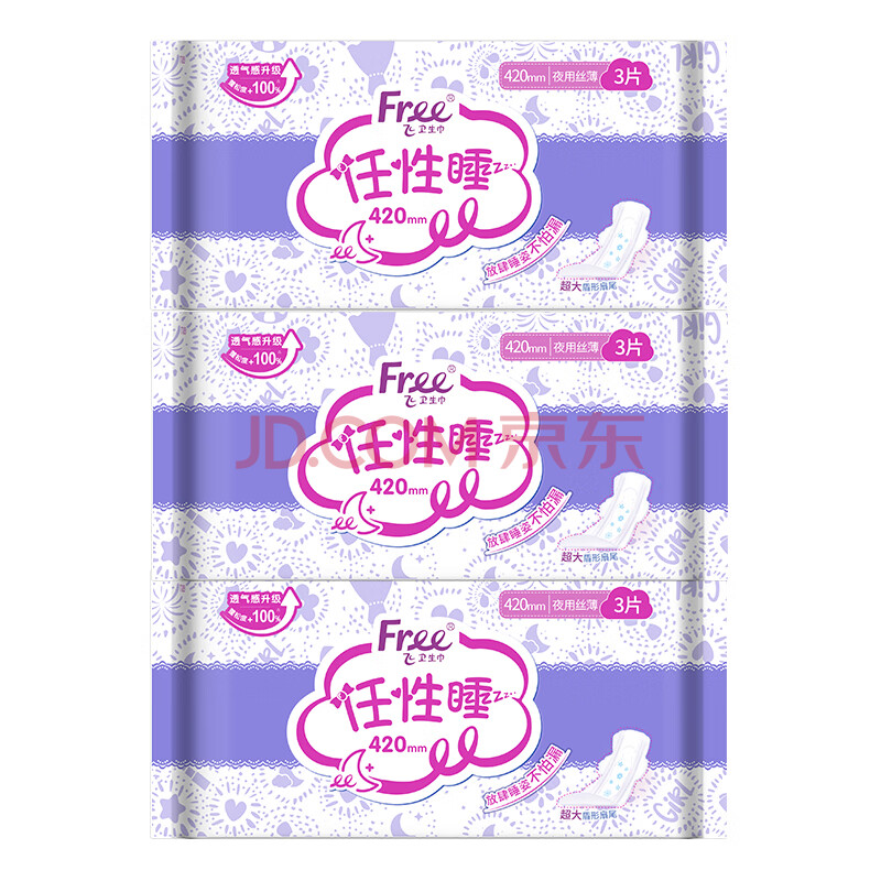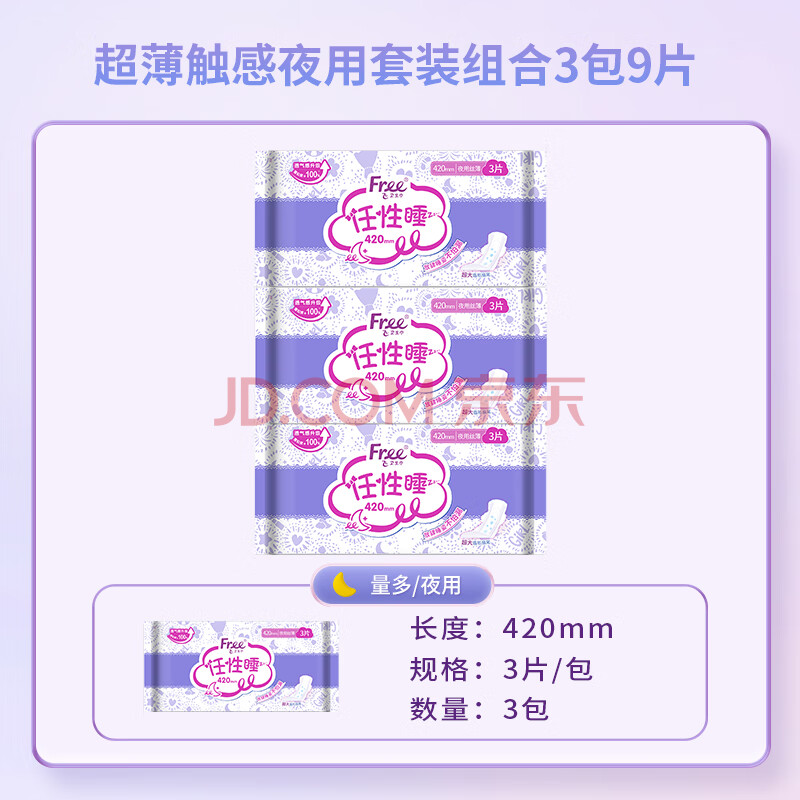 商品相册:FREE京东自营卫生巾热门夜用组合 姨妈巾套装亲肤立围系列420mm*9片第
