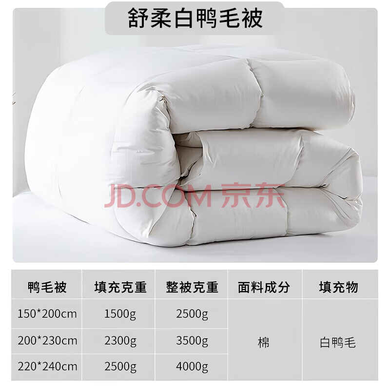 商品相册:源生活防钻绒 100%白鸭毛羽毛被子 双人四季被芯 8斤 220*240cm 白色第