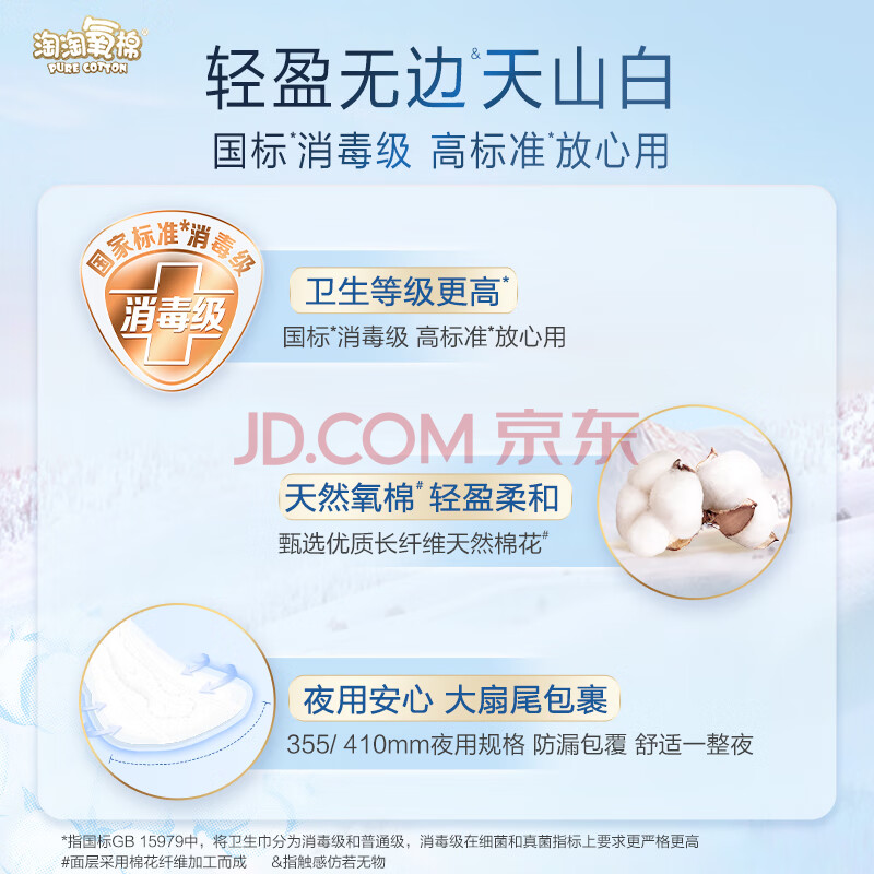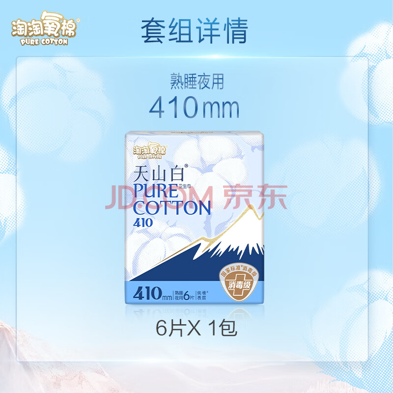 商品相册:淘淘氧棉天山白纯棉消毒级熟睡夜用卫生巾410mm*6片 京东自营第